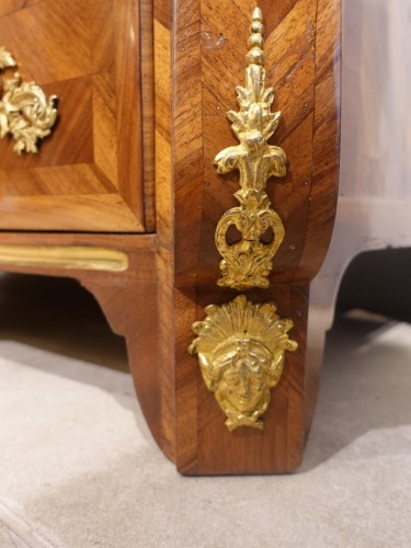 Ce modèle est mis en valeur par l'élégant enroulement en console de chaque montant antérieur d'où descend une guirlande de fleurettes et dont le méplat est souligné de deux puissantes cannelures en laiton qui font écho à celles ornant les trois traverses de la façade. Les pieds ...