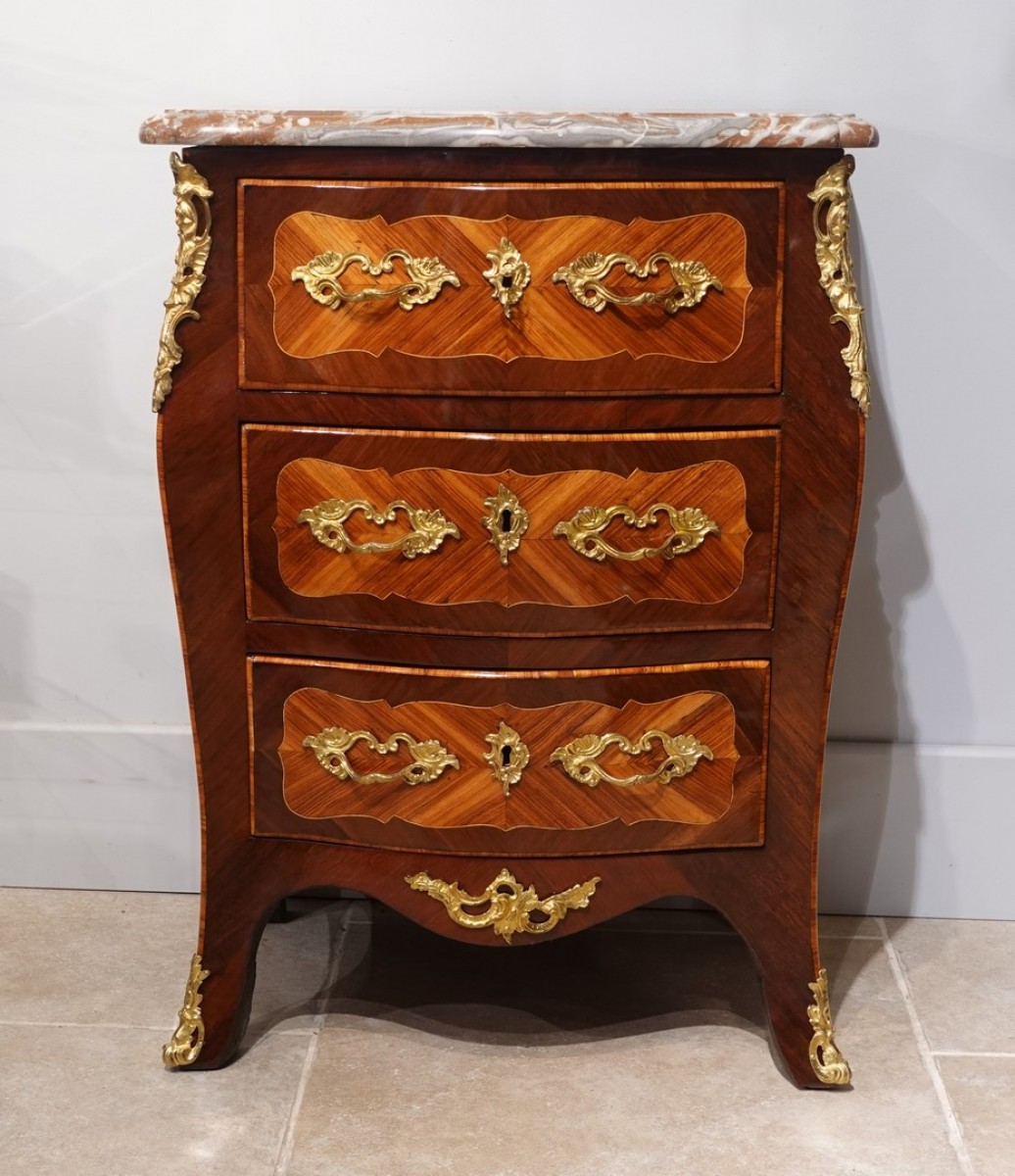 Ravissante commode d'entre deux, galbée en façade et sur les côtés ouvrant par trois tiroirs.
