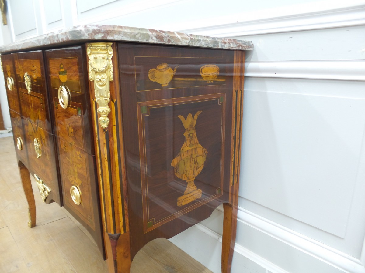 Commode d'époque Transtion de forme sauteuse à ressaut central ouvrant par 2 tiroirs sans traverse. En placage de bois de rose et amarante marqueté de vases fleuris, tasses, théières et instruments de musique. Elle repose sur quatre Pieds cambrés. Dessus de marbre rouge.