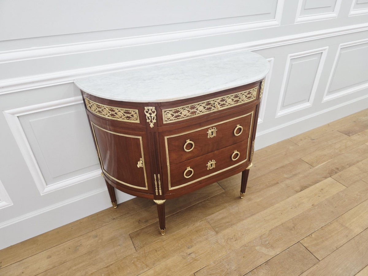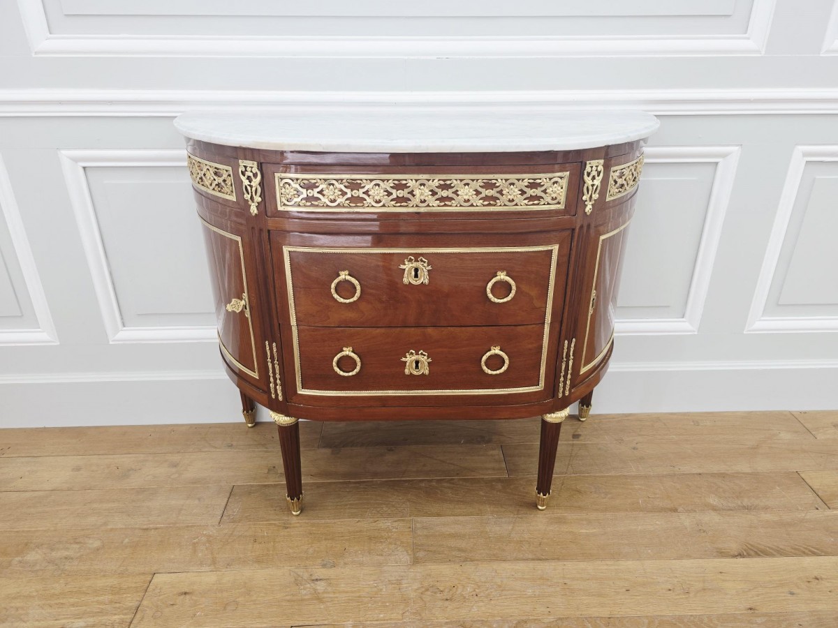 Commode demi-lune d'époque Louis XVI en acajou ouvrant par trois tiroirs en façade dont deux sans traverse et deux portes latérales. Plateau de marbre blanc carrare