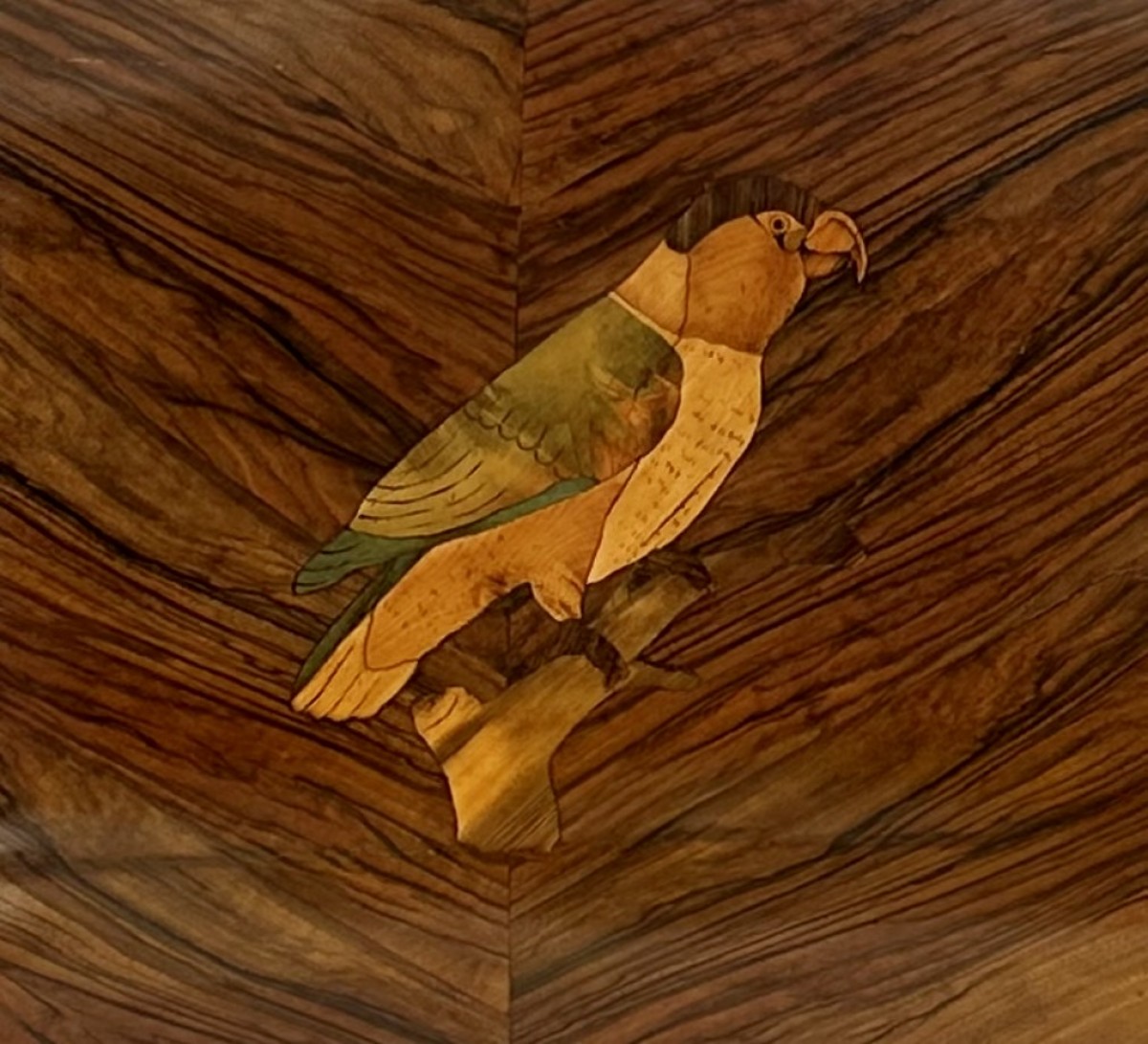 Galbée sur toute ses faces, et marquetée à décor d’un vase fleuri en façade et de perroquets sur les côtés.