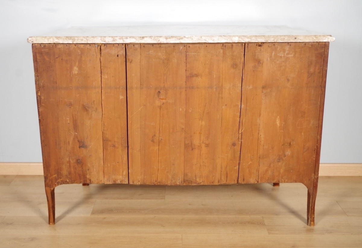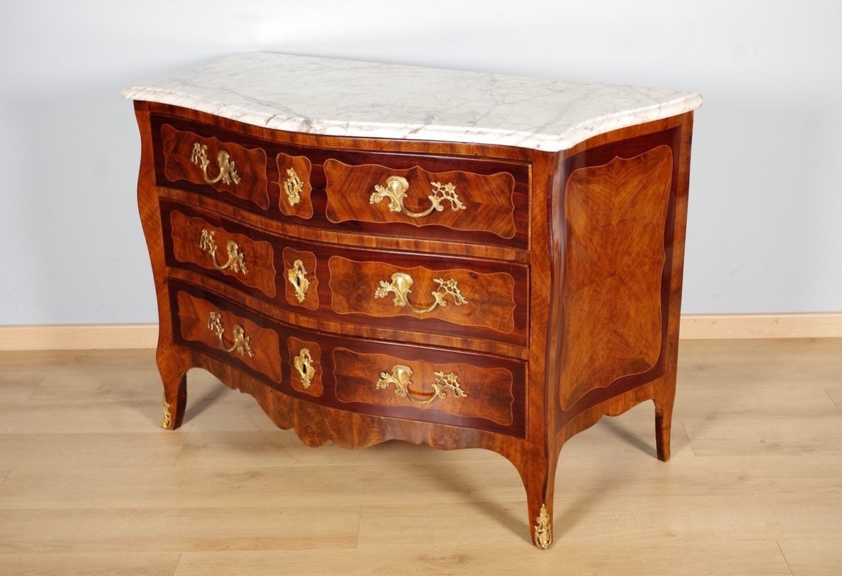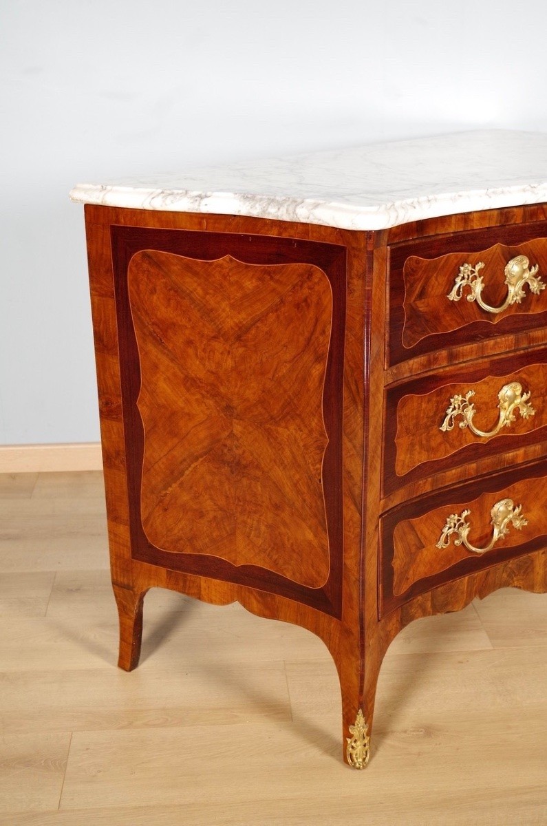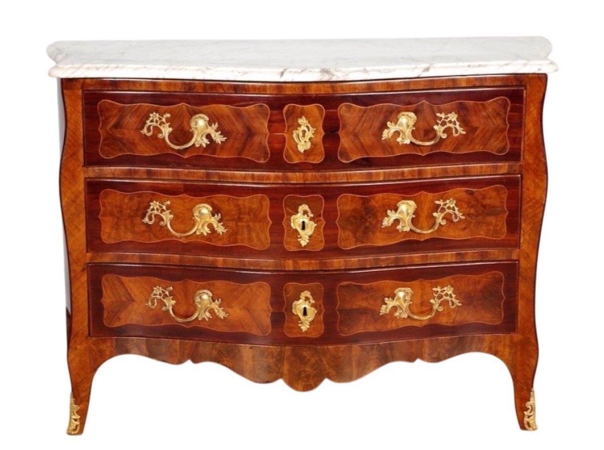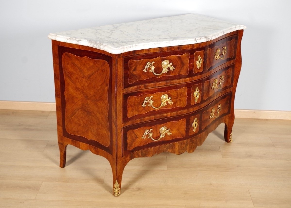 Galbée en façade et sur les côtés, elle ouvre par trois tiroirs.
