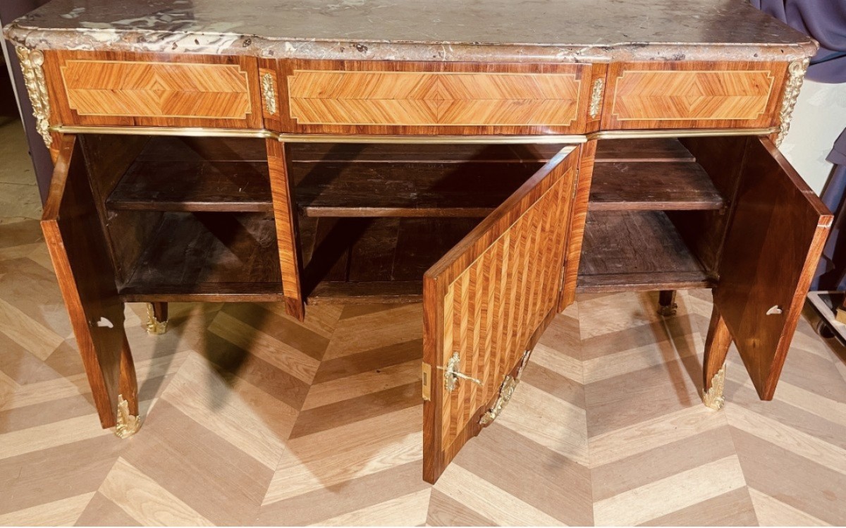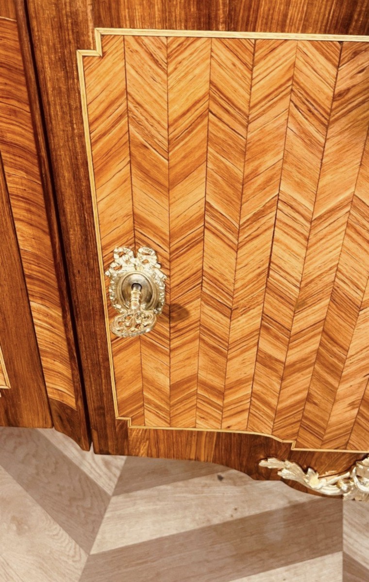 Elle est en marqueterie de bois de rose en forme de chevrons dans des encadrements de bois de violette.