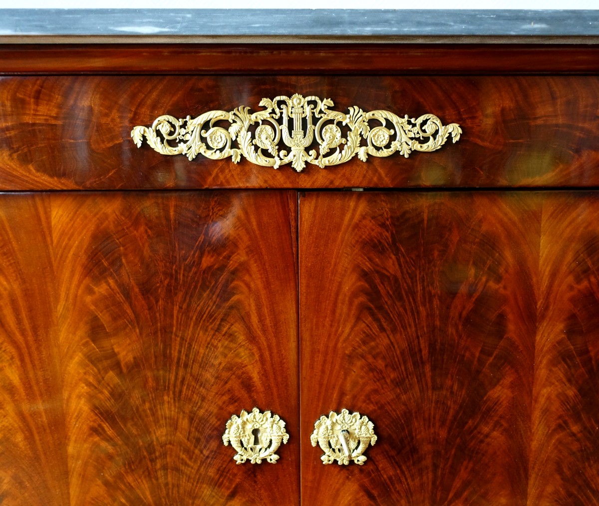 Rare commode à portes en acajou et plaquage d'acajou flammé de Cuba : élégant modèle fortement architecturé à 4 montants de section rectangulaire ornés de chapiteaux Egyptiens finement ciselé et de bases en bronze. Ce meuble raffiné est dit commode à l'anglaise puisque l'ouverture des deux battants découvre une série de 3 tiroirs plaqués d'acajou. Un autre tiroir en ceinture. Belle garniture de bronzes ciselés et dorés au mercure, tels que lyre, entrées de serrures en cornes d'abondance et couronnes de fleurs. Notre beau meuble est recouvert d'un marbre de luxe de couleur bleu turquin, légerement débordant à l'arrière de manière à reposer sur une boiserie basse. Fabrication parisienne de la fin de l'époque Empire ou du tout début de la Restauration, années 1810.