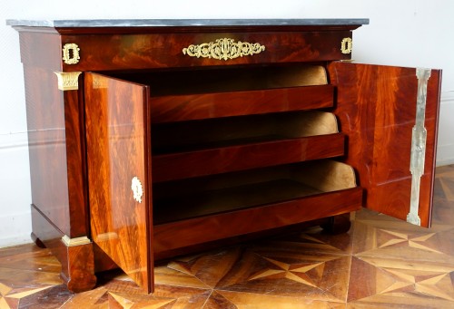 ... qui sont un grand raffinement, structure intégralement en chêne blond sans aucun nœud, beaux assemblages réguliers et soignés y compris sur les parties cachées, plaquage dacajou flammé d'excellente qualité y compris à l'arrière des pieds, partie normalement invisible mis qui prouve le soin apporté à la réalisation de ce meuble. Notre commode n'est pas estampillée, mais assurément le travail d'un plus grand ébénistes de l'Empire ou de la Restauration. Les brozes très finement ciselés sont peut être l’œuvre de Pierre-Philippe Thomire (plusieurs consoles de Thomire Duterme dans les collections nationales et Palais Impériaux avec des colonnes à sections carrées et ornements comparables). Le meuble par ailleurs d'excellente qualité de fabrication pourrait être une production de Jacob Desmalter ou de Charles Lemarchand, ébénistes qui ont tout deux collaboré avec Thomire. Belle pièce d'amateur en excellent état, vernis au tampon refait à neuf. Le marbre est intact, la dorure au mercure très belle.