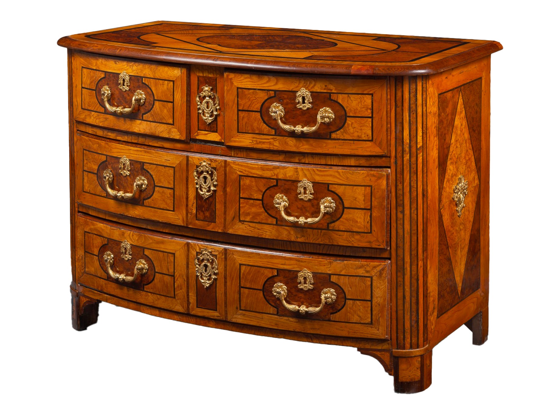 Cette jolie commode présente les caractéristiques d’un travail exécuté vers 1730/1740 dans la région de Grenoble ou un peu plus au sud. Contrairement à l’ébénisterie Parisienne, l’utilisation du Pin ne se limite pas aux façades des tiroirs et aux planches de structure ; les fonçures (ou intérieurs de tiroirs) sont également fabriquées en pin. La marqueterie est constituée de placages géométriques de bois indigènes et non exotiques importés des Indes comme c’était le cas pour les meubles parisiens. Le dessus de bois est également caractéristique du Dauphiné ou on ne produisait pas de commode à dessus de marbre à cette époque.