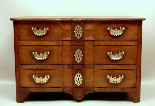 Le dessus, en larges planches assemblées en coupe d'onglet, est mouluré sur son pourtour d'un bec-de-corbin qui épouse les formes de la commode, les tiroirs affleurants sont vigoureusement galbés en arbalète à plan convexe, les larges montants sont arrondis et se terminent par des pieds droits avec becquets rapportés aux épaulements avec la traverse basse. Les côtés sont lisses et dits "en miroirs".
