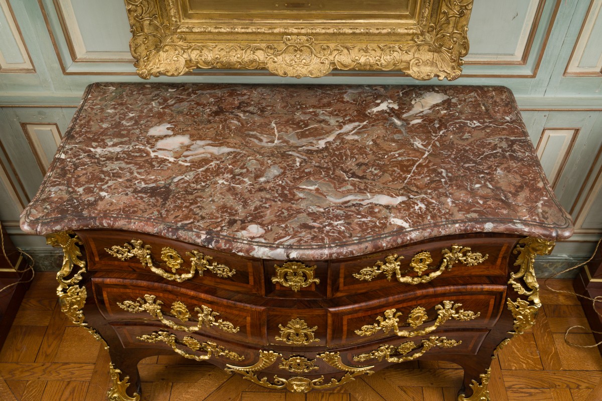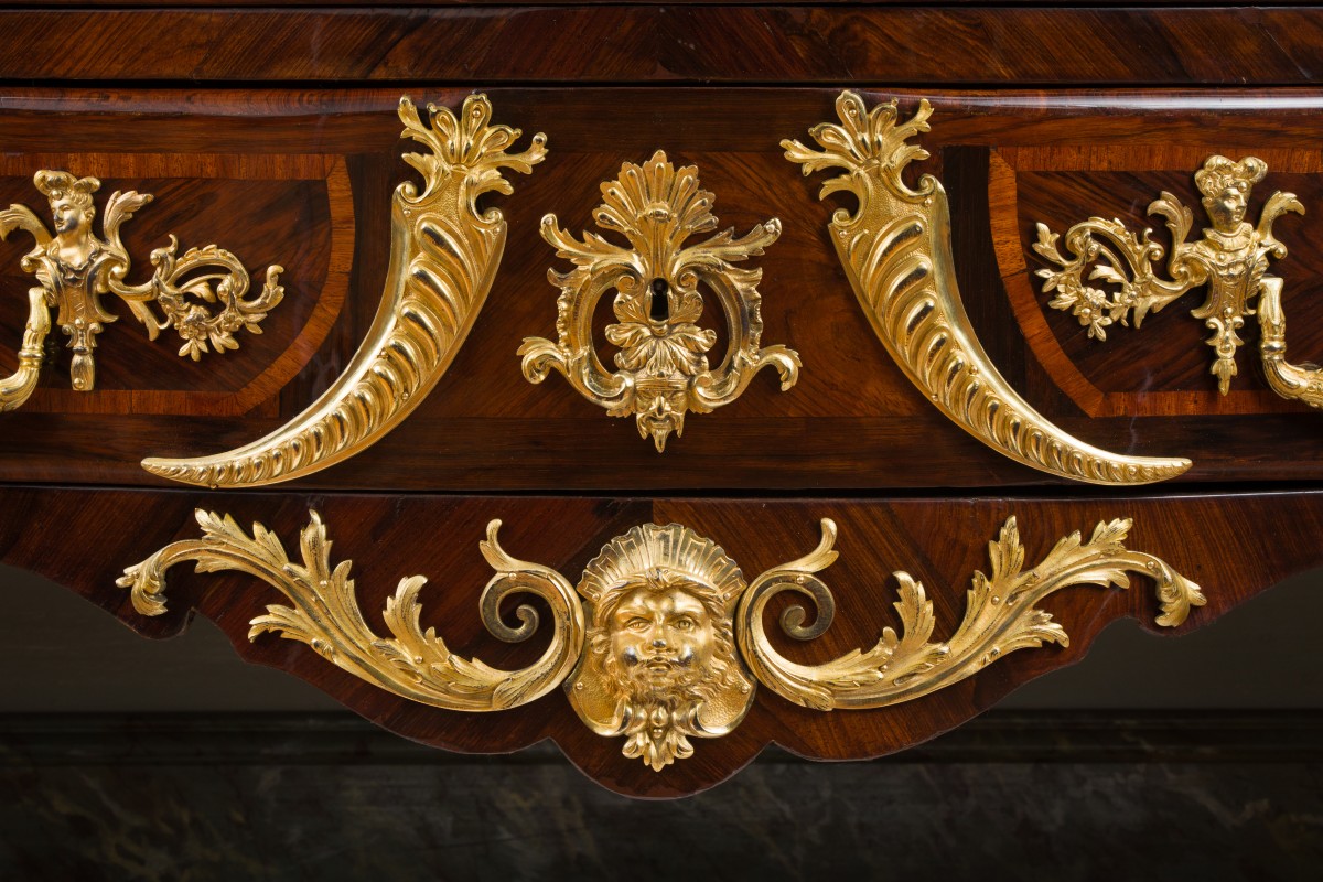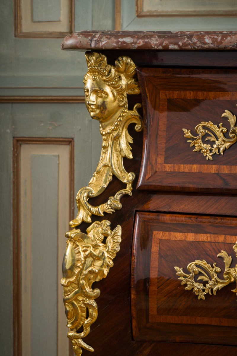 Commode en palissandre de forme très mouvementée, ouvrant à cinq tiroirs sur trois rangs, le dessus de marbre rouge des Flandres reposant sur des montants galbés terminés par des pieds cambrés. Ornementation de bronzes à bustes de femme, masque de Borée, moustaches, chimères et mufles de lions aux sabots. Que ce soit les montants ornés de cariatides et chimères dont la queue s'enroule autour de la chute, les poignées à valets en forme de dragons, les entrées de serrures particulièrement ouvragées avec masques et le tablier arborant le masque de Borée, flanqué de deux volutes d'acanthe, toute l'ornementation de bronze accentue la richesse de notre commode.