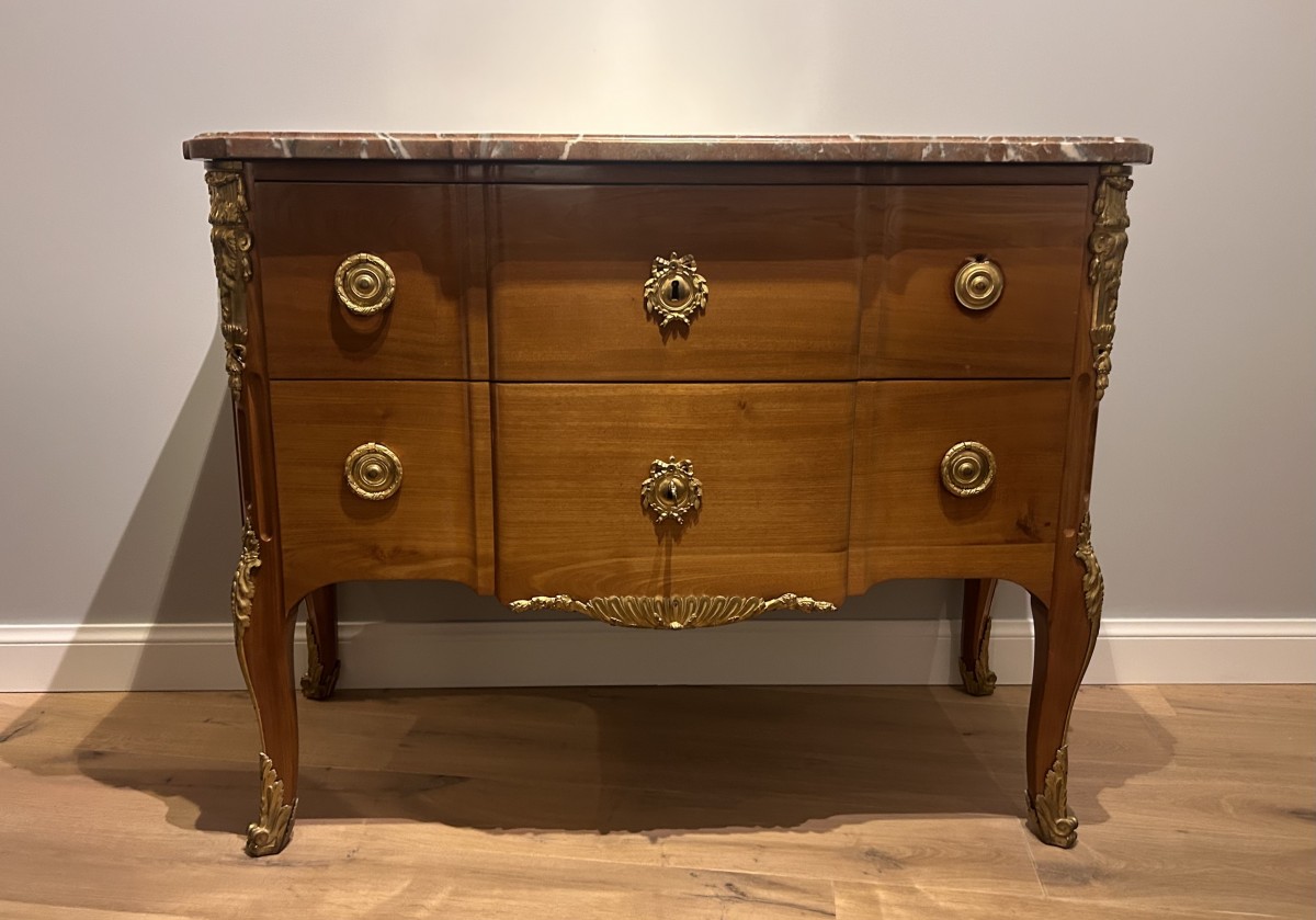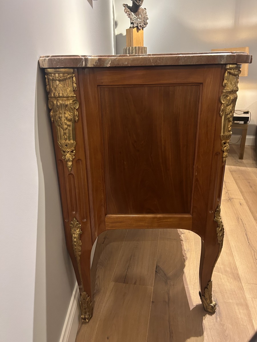 Commode à deux tiroirs sans traverse en acajou massif, ornée de bronzes ciselés et dorés. Dessus de marbre rouge belge, de Rance présentant un congé.