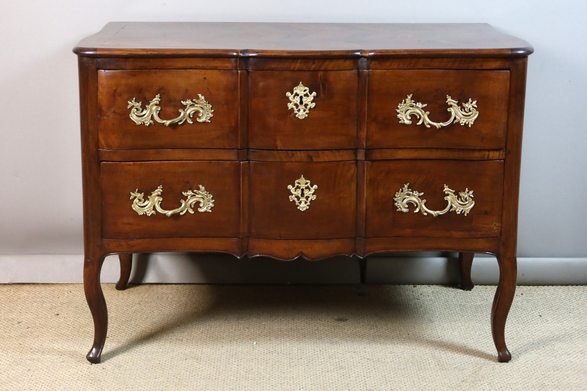 Commode sauteuse en noyer mouluré Louis XV arbalète. Cette jolie commode caractéristique de la région de Grenoble repose sur quatre pieds légèrement galbés, elle ouvre par deux tiroirs. Les poignées de tirage et les entrées de serrure sont en bronze doré. Le plateau est parqueté en noyer, frêne et merisier. Ce meuble a été restauré donc en très bon état. Epoque XVIIIe siècle.