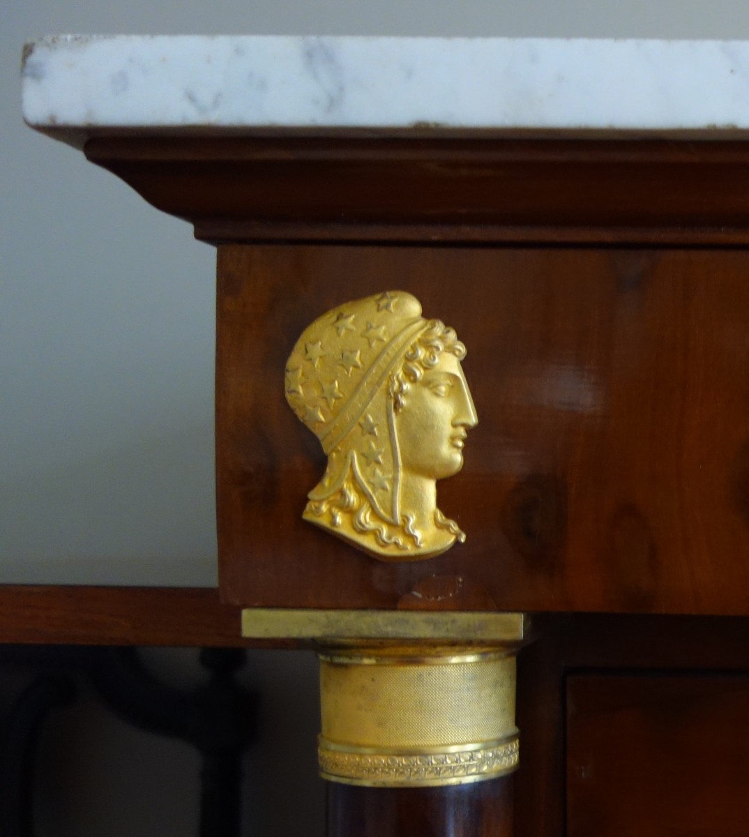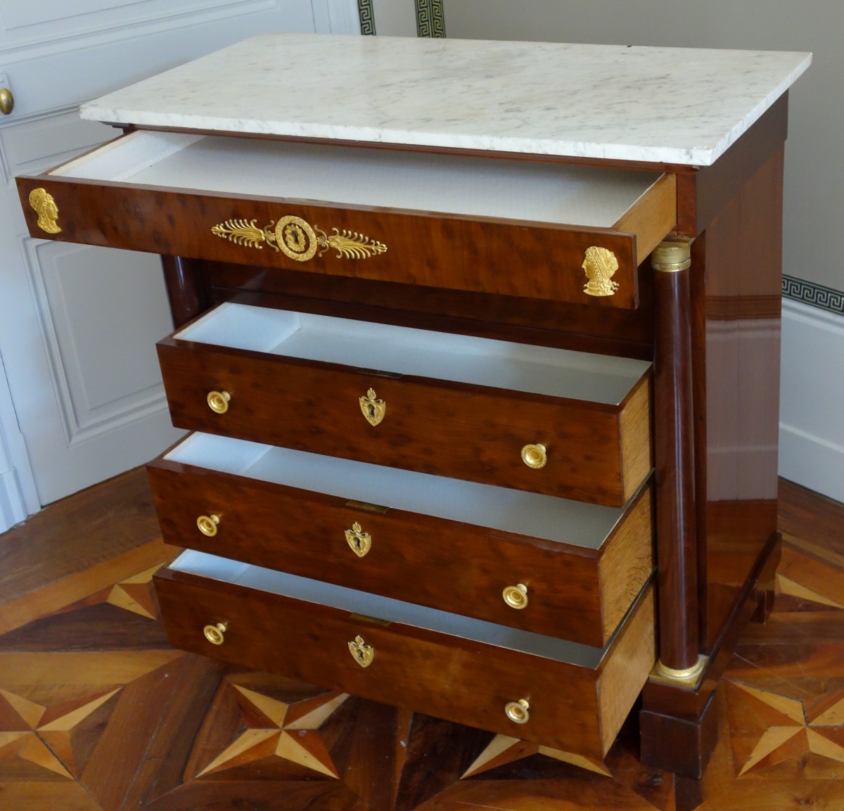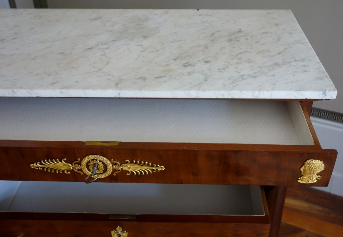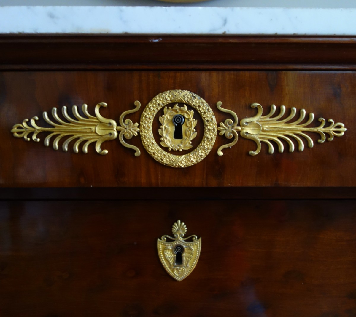 Notre meuble est en excellent état. Vernis au tampon intégralement refait à neuf en 2018, nettoyé et repoli par notre ébéniste en 2026. Dorure au mercure des bronzes bien conservée et sans usure. Complet, avec sa clé en cercles concentriques (serrure incrochetable, comme les serrures à trèfle). Intérieur des tiroirs garnis de cotonnade blanche à motifs de minuscules abeilles. Une petite fente ancienne sur le marbre à droite.