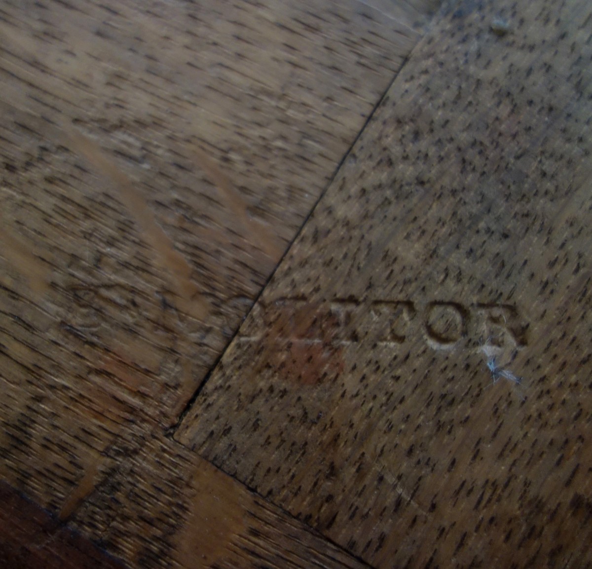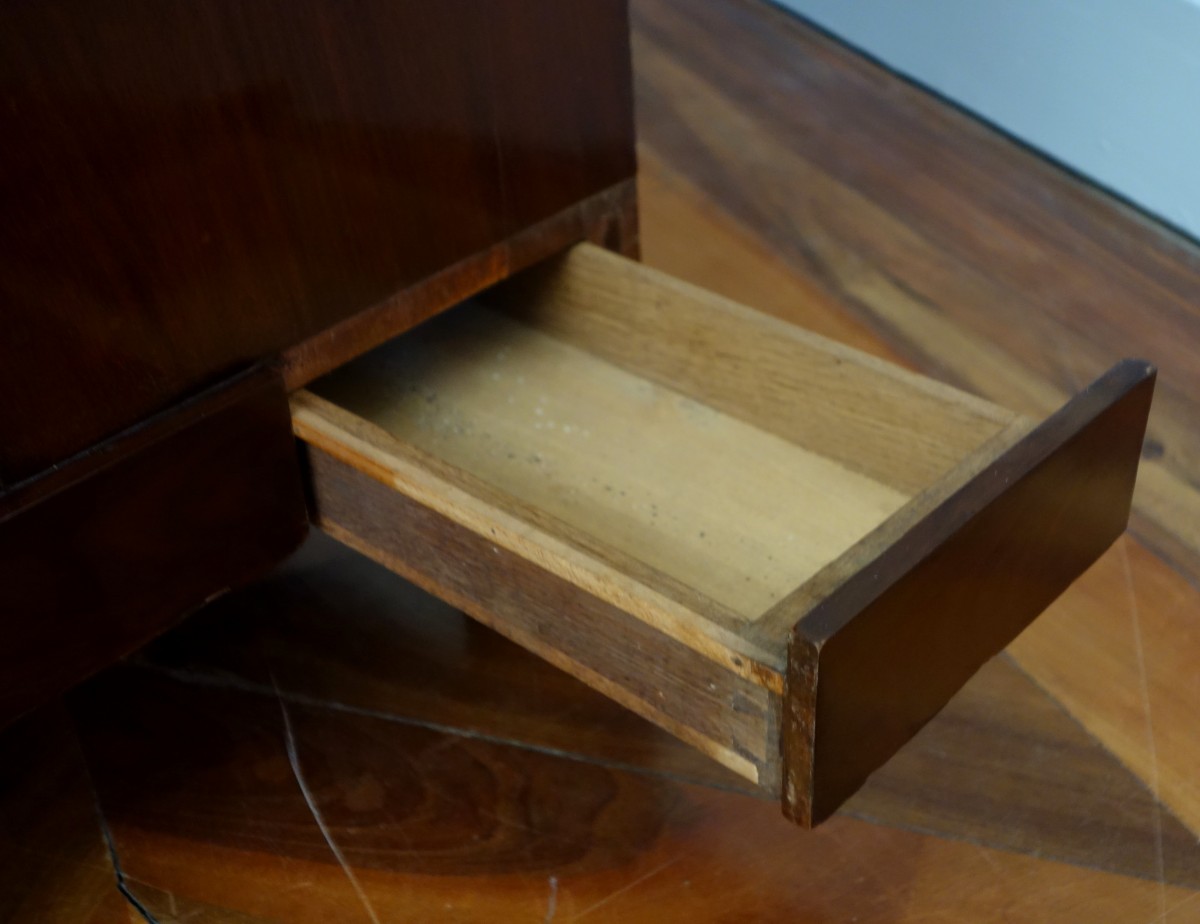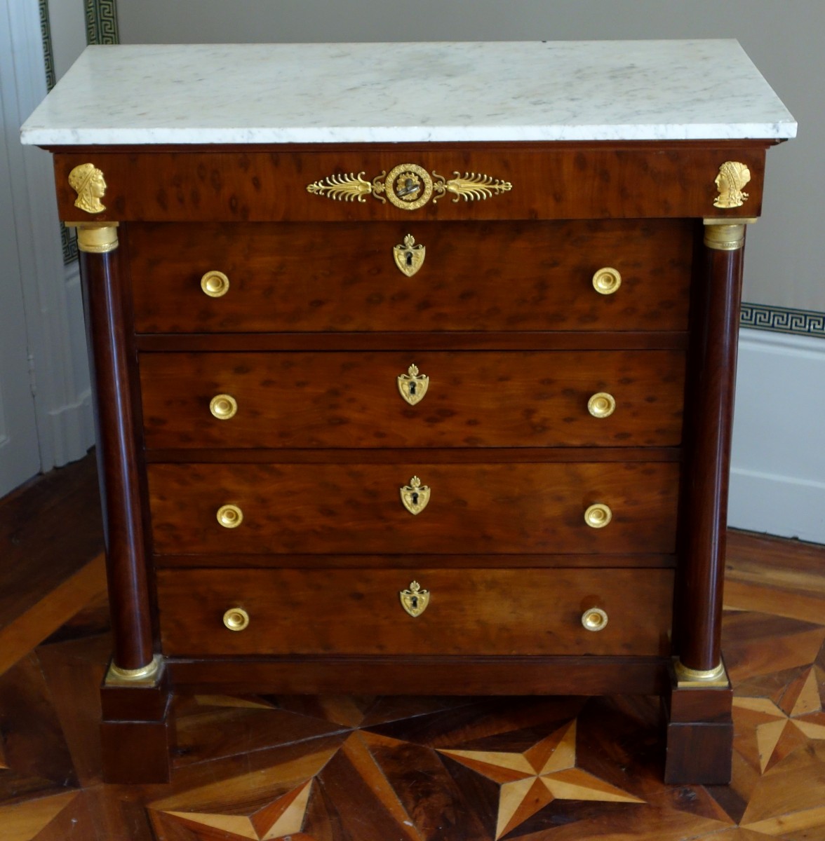 Notre meuble est en excellent état. Vernis au tampon intégralement refait à neuf en 2018, nettoyé et repoli par notre ébéniste en 2026. Dorure au mercure des bronzes bien conservée et sans usure. Complet, avec sa clé en cercles concentriques (serrure incrochetable, comme les serrures à trèfle). Intérieur des tiroirs garnis de cotonnade blanche à motifs de minuscules abeilles. Une petite fente ancienne sur le marbre à droite.