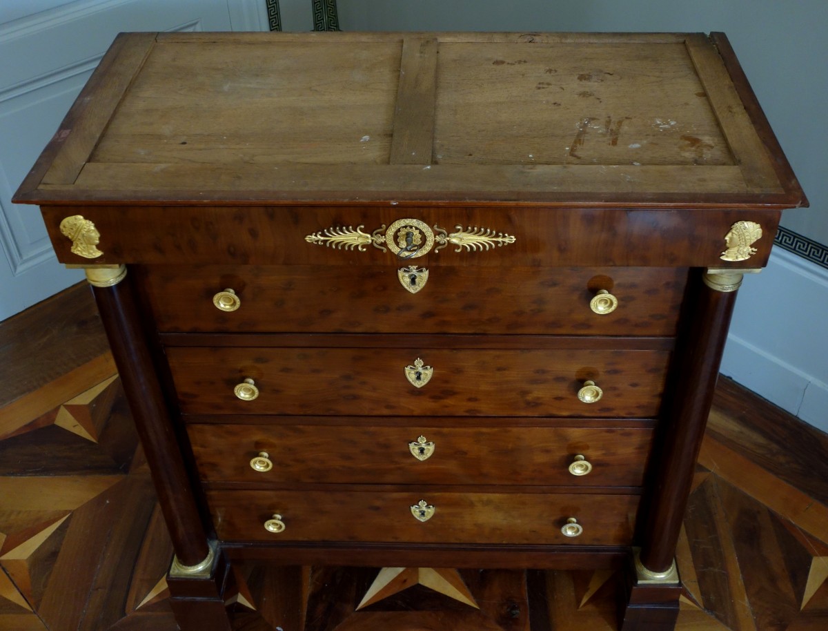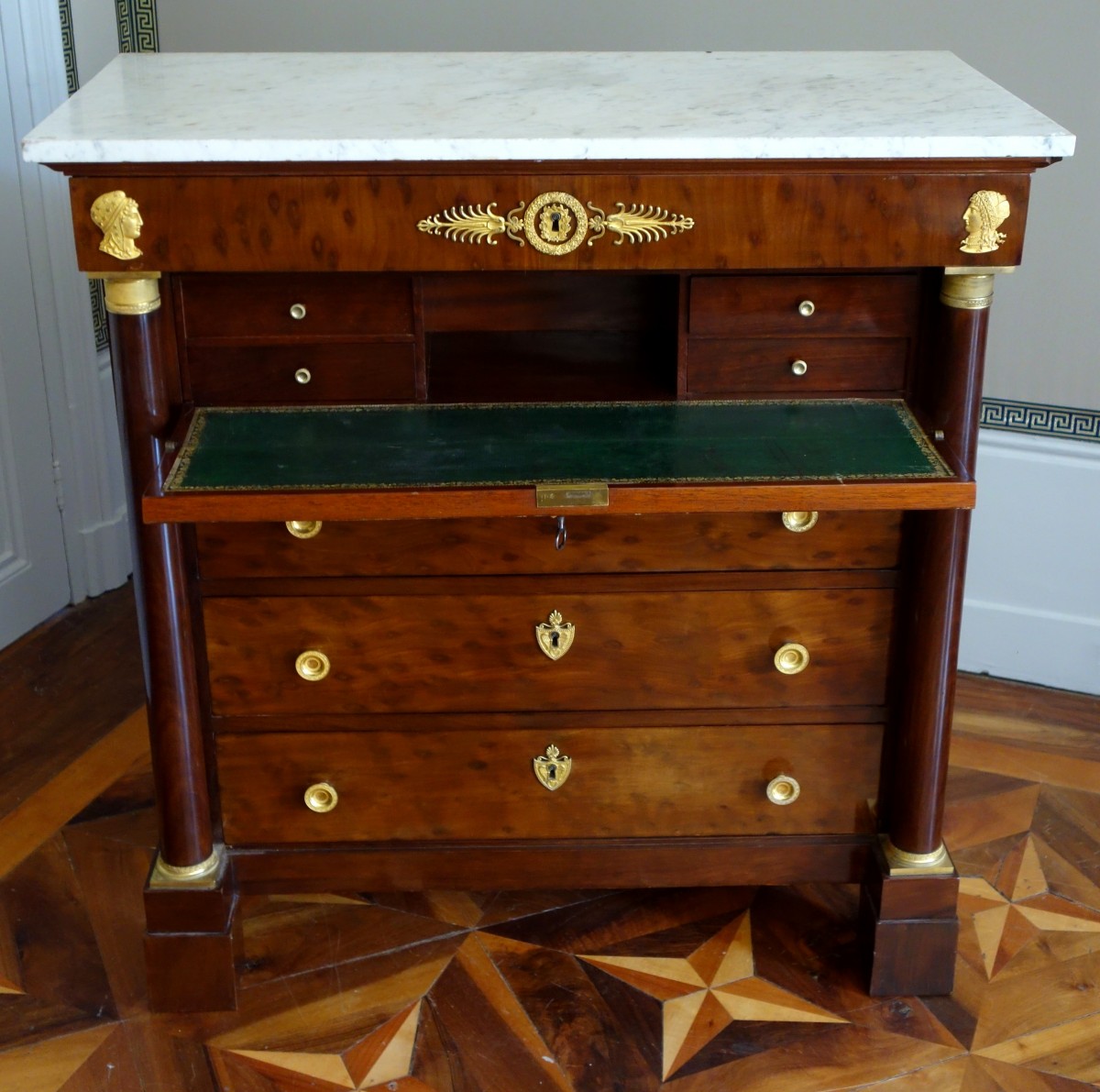 Commode secrétaire en acajou moucheté, modèle à colonnes coiffée d'un marbre blanc ouvrant par 3 grands tiroirs, le quatrième cachant un secrétaire qui se déplie et le 5e plus fin sous le marbre. Une tirette en acajou sur la gauche. Notre commode a aussi des secrets : 2 cavités qui glissent dans le tiroir de part et d'autre du "plan de travail" et aussi une astucieuse cachette camouflée dans la plinthe en bas à droite. Caisse intégralement en chêne, estampille de Bernard Molitor sur le dessus. Riche garniture de bronzes ciselés et dorés en mat et brillant attribués à Thomire (qui collabora beaucoup avec Molitor). Epoque Empire vers 1810.