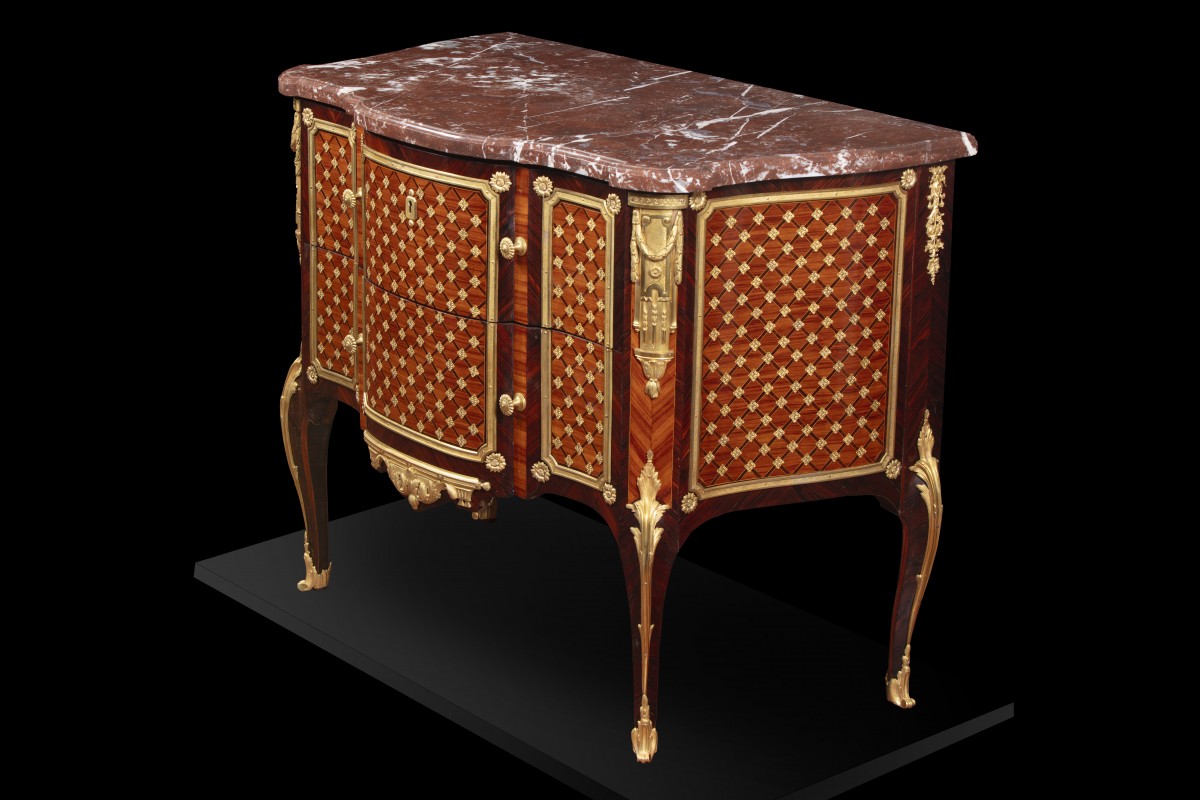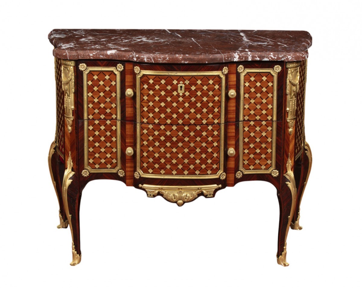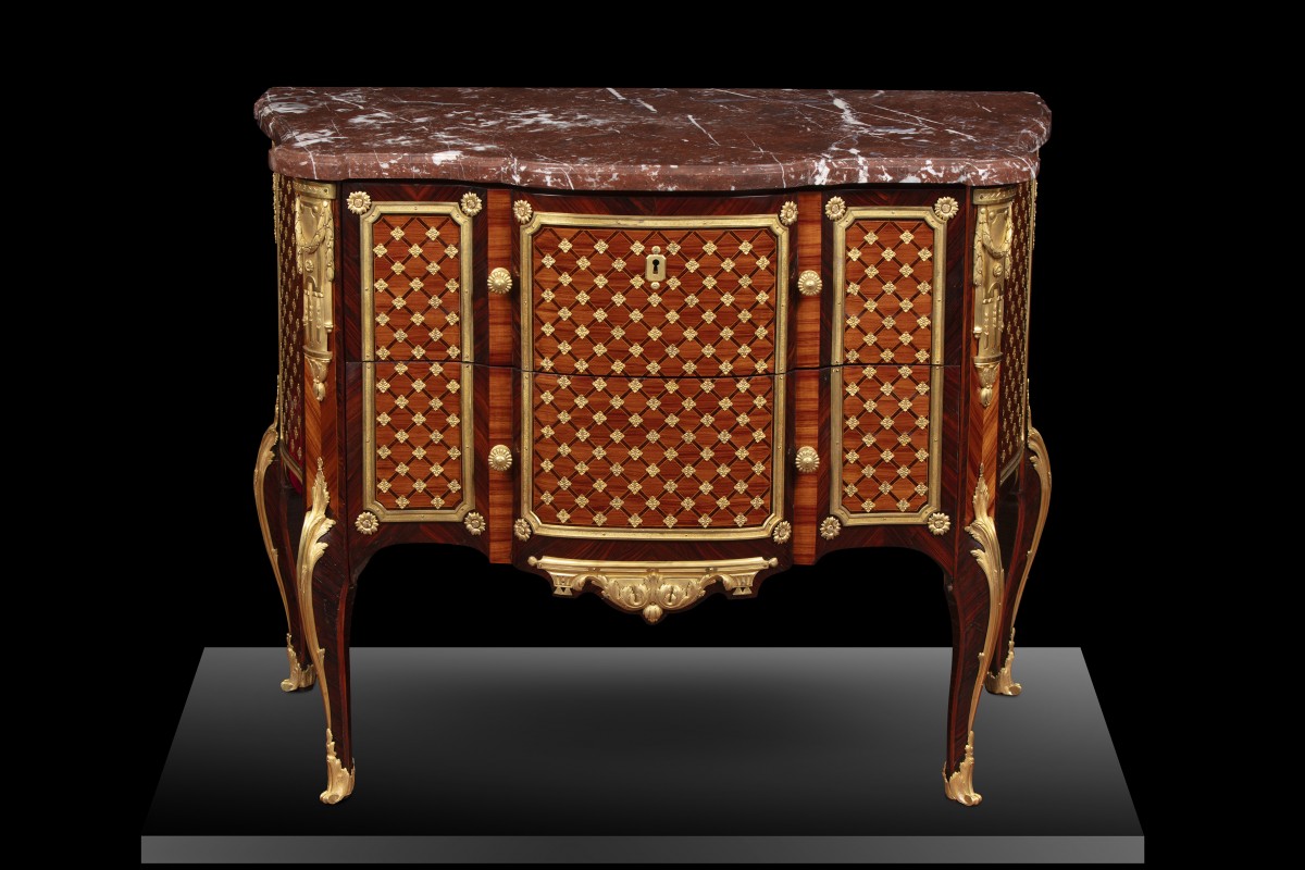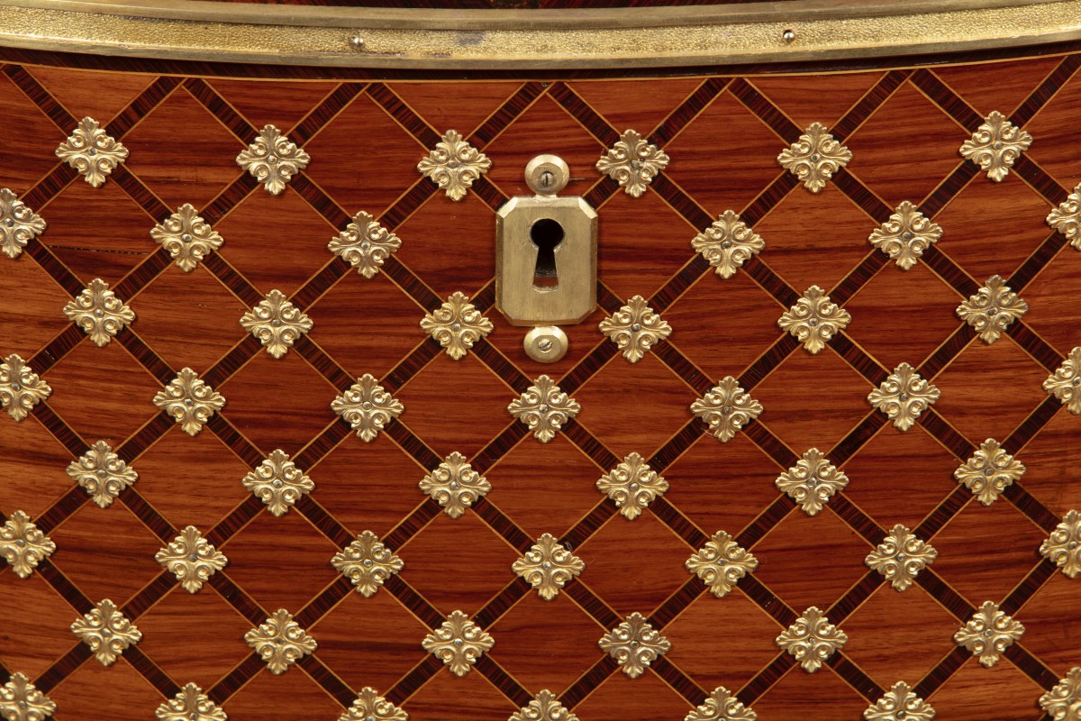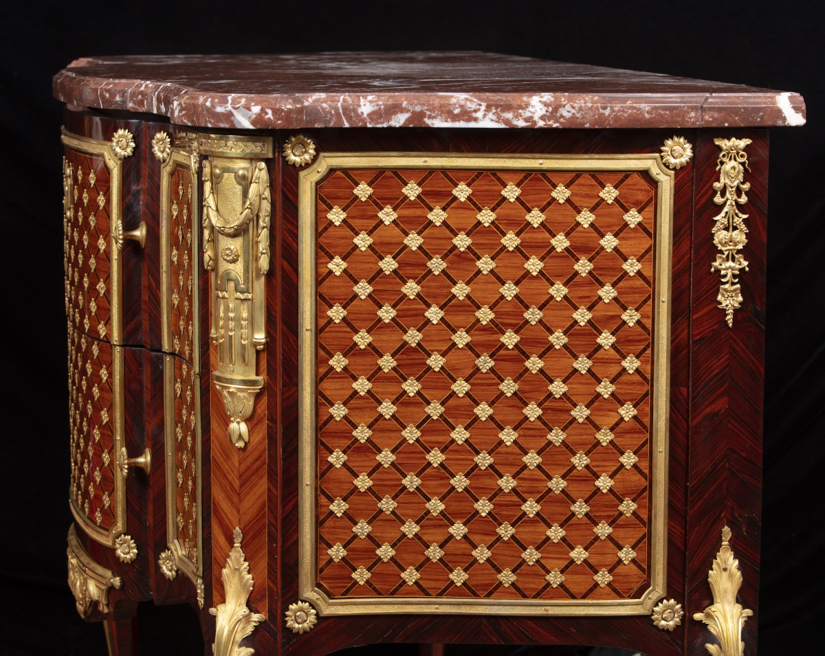 Commode à deux tiroirs sur une structure en chêne plaquée de palissandre et de bois de violette. La façade sinueuse est ornée de trois panneaux à motif de treillis, rehaussés de rosaces en bronze doré à leurs intersections. Les panneaux sont bordés de galons en bronze doré aux angles arrondis, également ornés de rosaces en bronze. Les côtés incurvés sont décorés de panneaux similaires. Chaque tiroir est muni d'une poignée en forme de bouton en bronze doré. Le plateau est en marbre rouge griotte veiné, et l'ensemble repose sur quatre pieds incurvés aux ornements en bronze doré. Cette commode, datant de la fin du XVIIIe siècle ou du début du XIXe siècle, est une copie d'une commode de Gilles Joubert (Paris, 1689-1775), conservée au Victoria and Albert Museum de Londres. Époque : fin du XVIIIe siècle – début du XIXe siècle. Dimensions (H x L x P) : 90 x 110 x 63 cm.