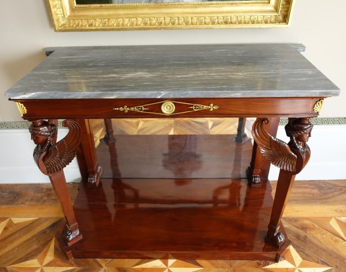 Console d'époque Consulat en acajou et plaquage d'acajou à fond de glace, coiffée d'un bleu turquin. Elle repose sur deux bustes en gaine de femmes ailées, terminées par des pattes de lion.Riche garniture de bronze ciselé et doré au mercure en mat et brillant : losanges, palmettes dans les angles. Elle est coiffée d'un marbre de luxe, bleu Turquin qui suit avec un décrochement celui de la console qui s'élargit vers l'arrière de part et d'autres des pilastres antérieurs. Le fond est garni d'un superbe miroir au mercure, au tain scintillant sur toute la surface. Travail parisien intégralement plaqué sur chêne.Production de belle qualité d'époque Consulat ou début de l'Empire, années 1800-1805, à rapprocher de l'oeuvre de Bernard Molitor ou d'un ébéniste équivalent comme Jacob Frères qui utilise aussi ces femmes ailées en consoles de fauteuils.
