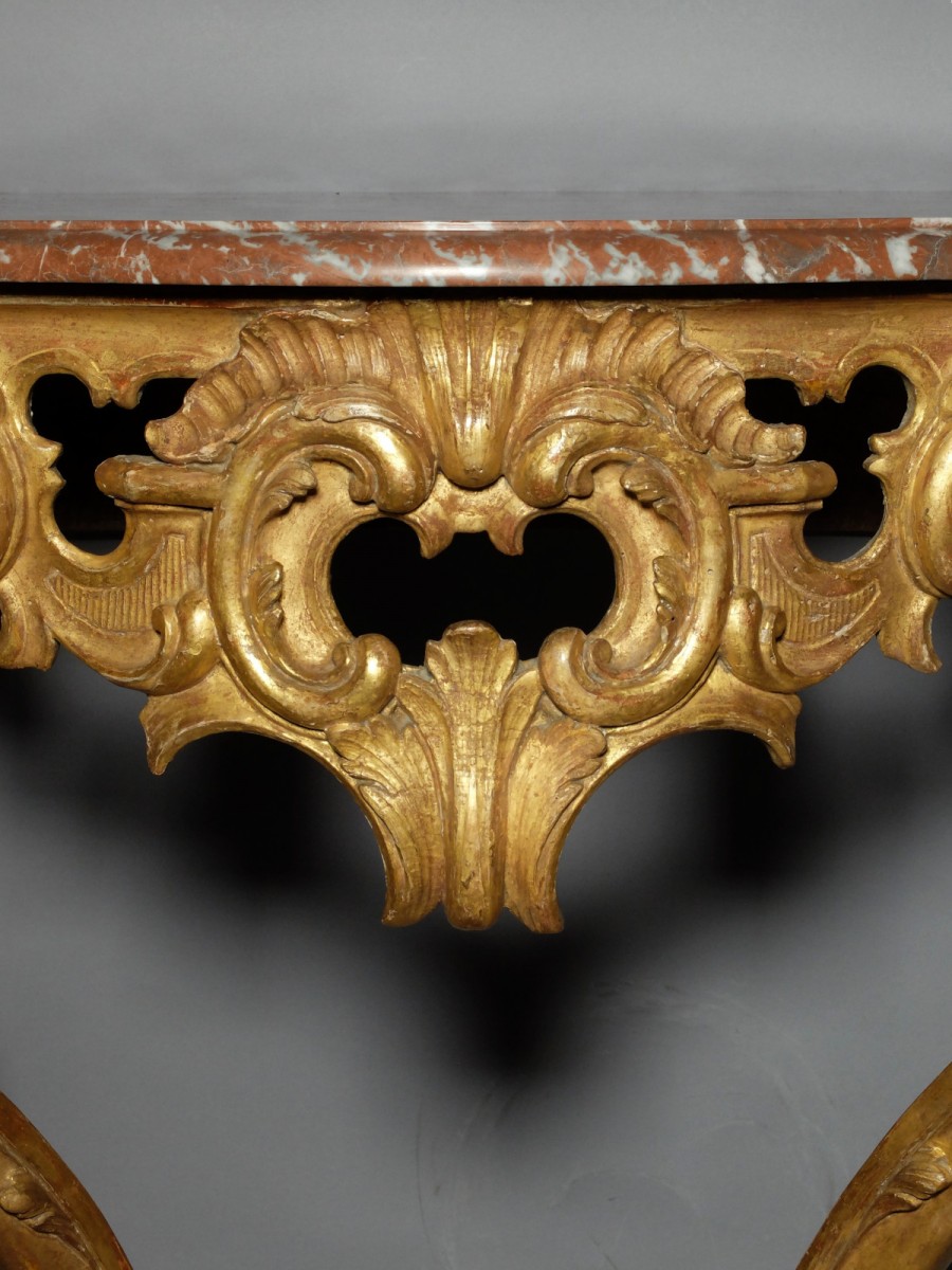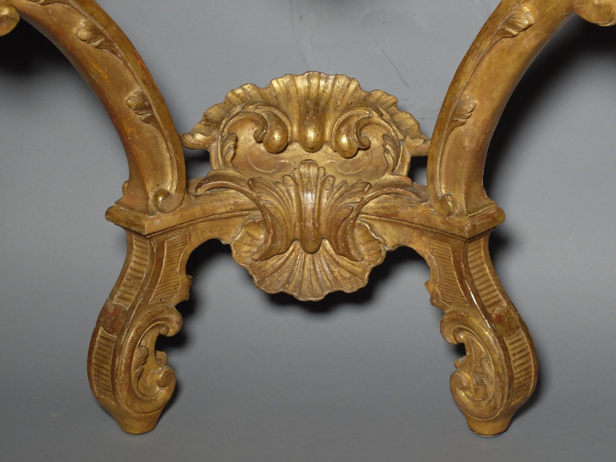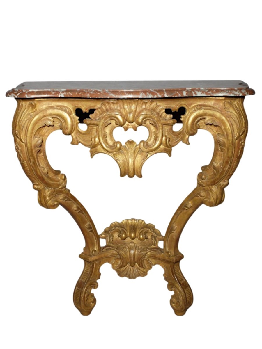 Console en bois sculpté et doré, reposant sur 2 pieds cambrés ornés de feuillages et encadrant une traverse de ceinture à décor de cartouches, de feuillages et de rocailles ajourés.