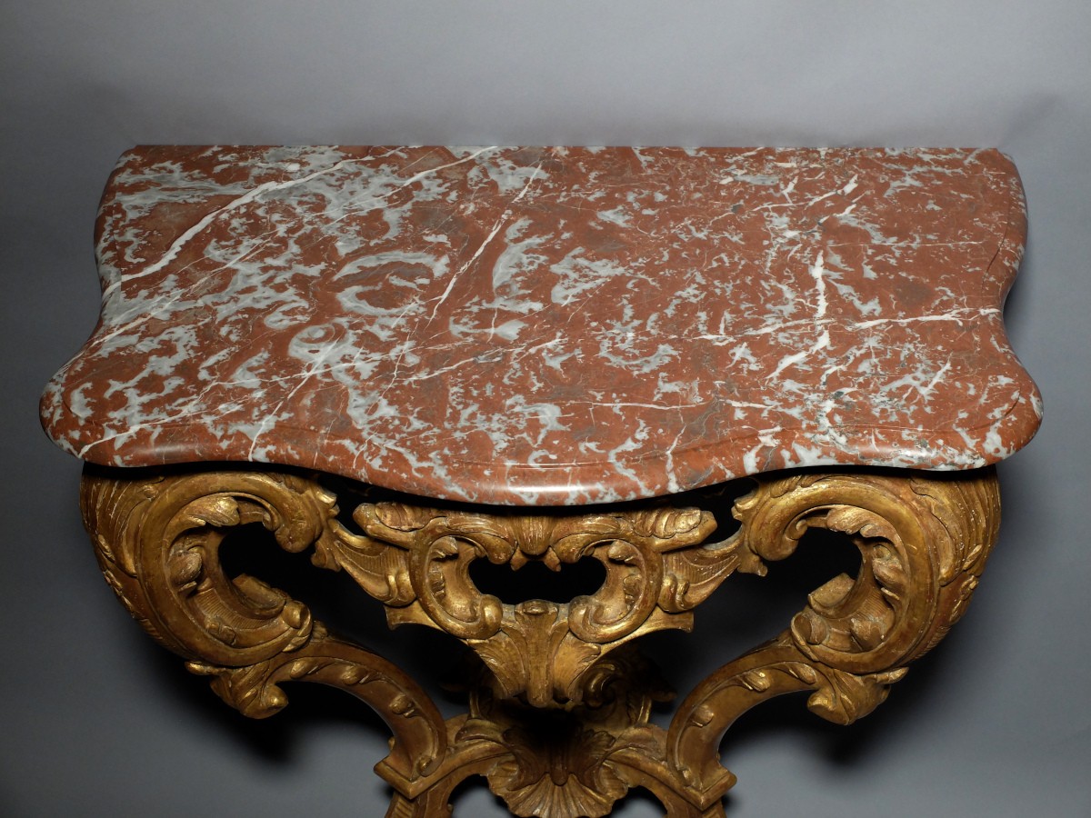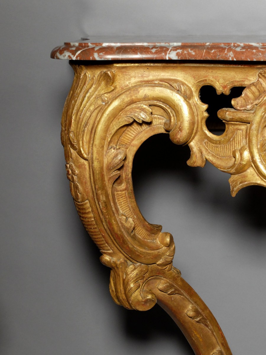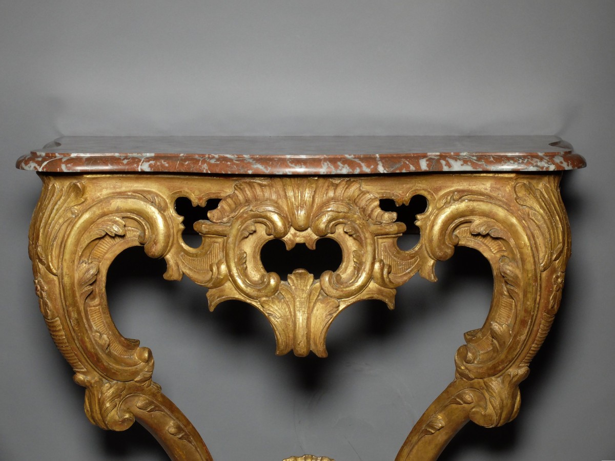 Console en bois sculpté et doré, reposant sur 2 pieds cambrés ornés de feuillages et encadrant une traverse de ceinture à décor de cartouches, de feuillages et de rocailles ajourés.