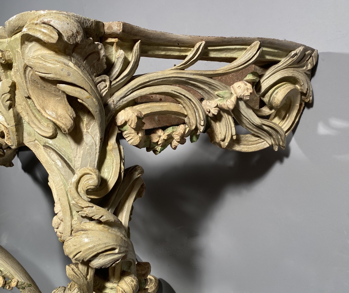 Retrouver le mobilier ou les objets d''art similaires à « Console à décor rocaille dans sa polychromie d’origine, Epoque Louis XV » présenté par Franck Baptiste Paris, antiquaire à Paris dans la catégorie Console Louis XV, Mobilier.