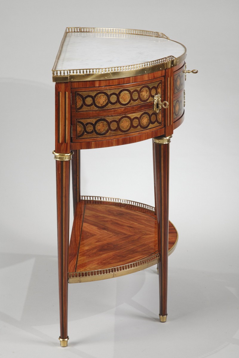 Console demi-lune en bois de placage marquete?e d’entrelacs ouvrant a? deux tiroirs et deux portes cintre?es reposant sur quatre pieds fusele?s a? cannelures simulée et tablette d’entrejambe.