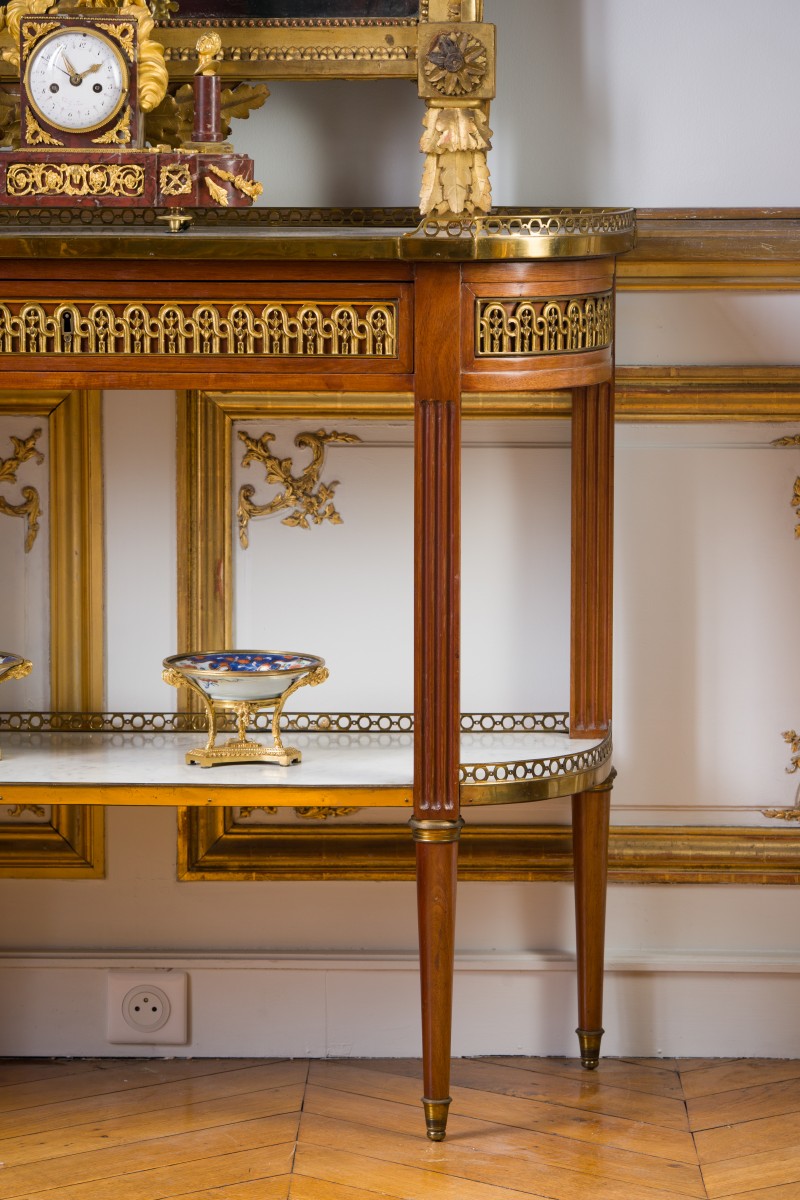 Console en acajou avec dessus et tablette en marbre de carre blanc. Une galerie ajourée avec formes géométriques court sur le pourtour du meuble. Une frise d’entrelacs alternant avec des asperges s’ajuste à la ceinture du meuble. Les montants présentent des cannelures sur leur quatre faces. La console repose sur quatre pieds fuselés avec sabots en bronze doré.