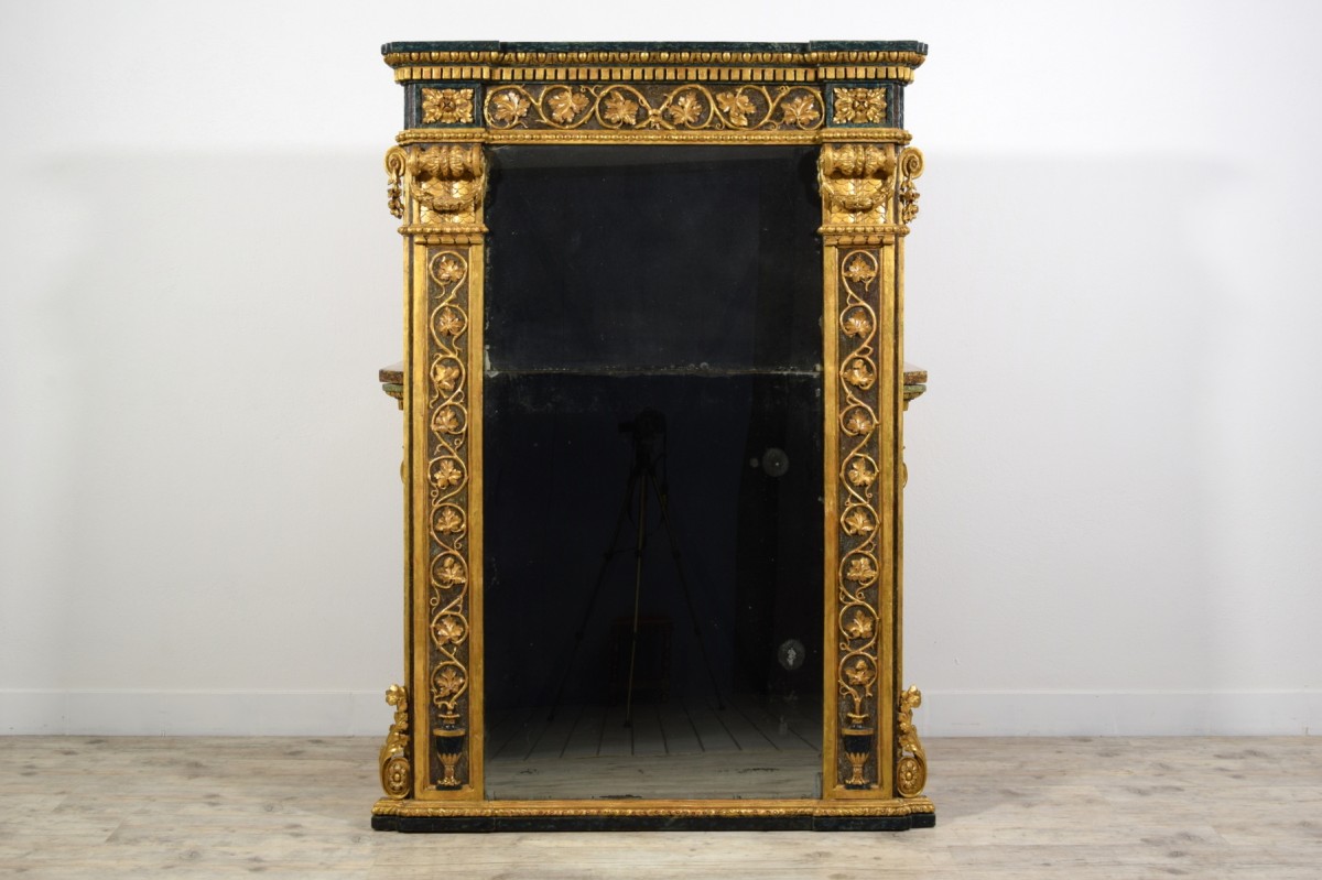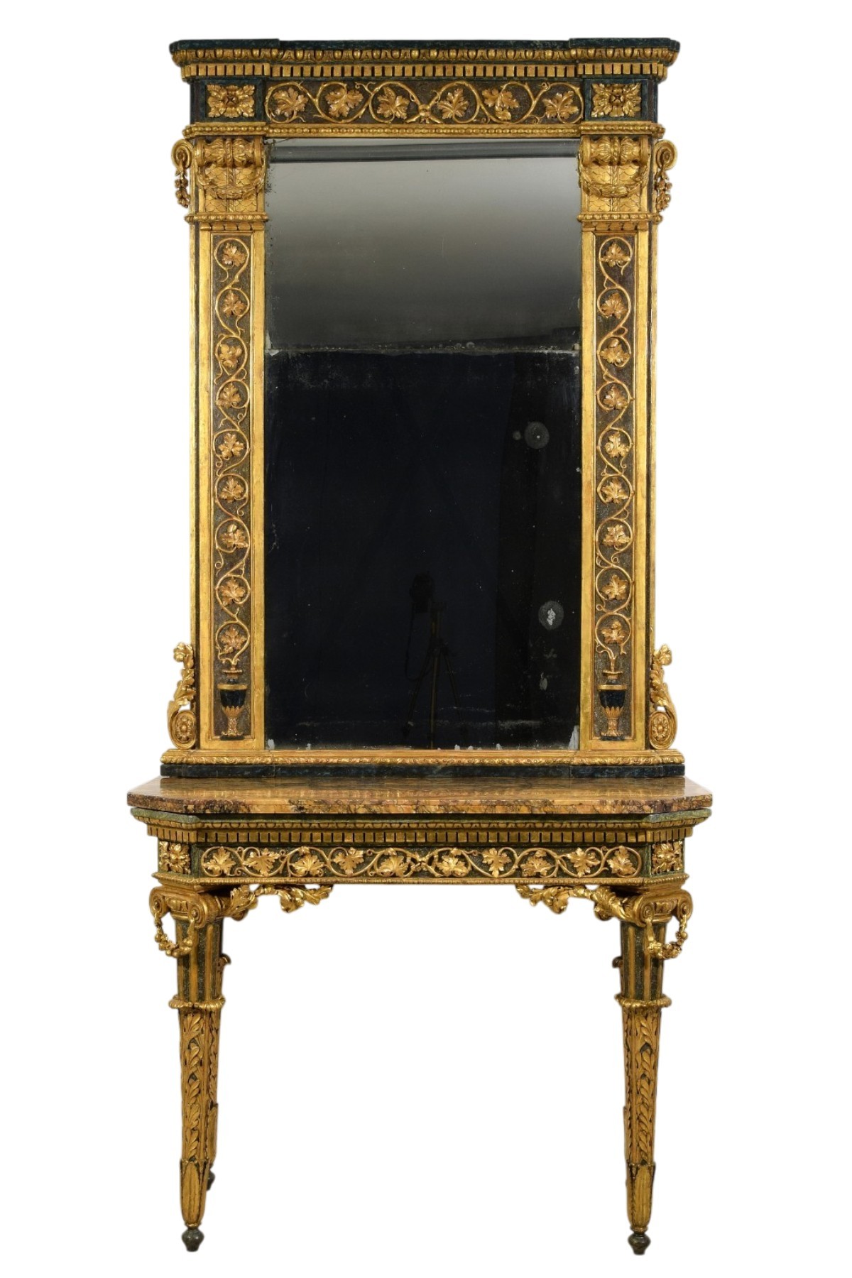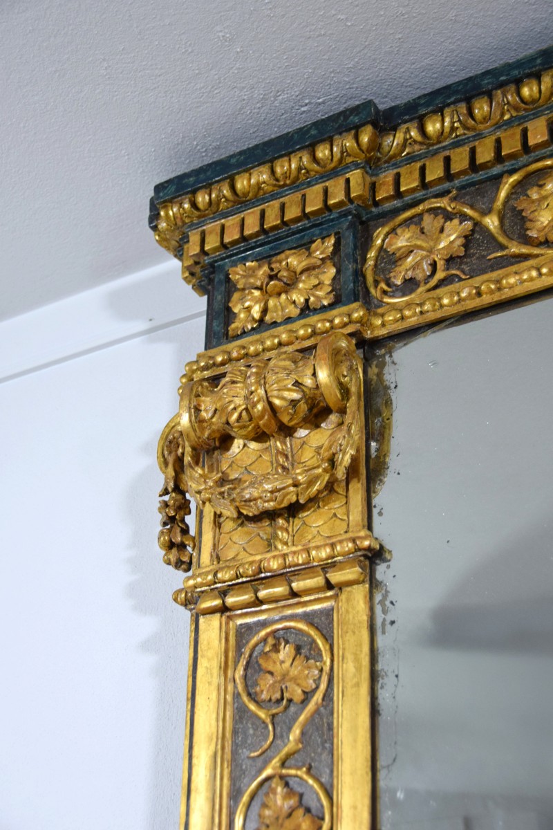 Le miroir reprend la décoration de la console. De forme quadrangulaire, il se compose d’une base en bois laqué en faux marbre Verde Antico sur laquelle repose un cadre sculpté et doré. Les autres côtés du miroir présentent, à l’intérieur de réserves dorées, sur un fond laqué en faux Porphyre, le même orné que la bande sous plan de la console : des vases de goût classique laqués au faux lapis lazuli avec des bases laquées en faux Verde Antico, donnent lieu à des ramages de feuilles de vigne avec des feuilles dorées qui parcourent tout le périmètre. Sur les côtés, deux décorations en bois doré sculpté avec une volute centrée par une fleur qui se développe vers le haut dans une grande feuille émoussent la composition. Les côtés verticaux du cadre se terminent par d’élégants chapiteaux dorés avec des volutes et des éléments feuillus et des guirlandes. Le cadre se termine vers le haut avec une bande sculptée avec des réserves à motifs à dents et ovules dorés et bande laquée en faux marbre Verde Antico.