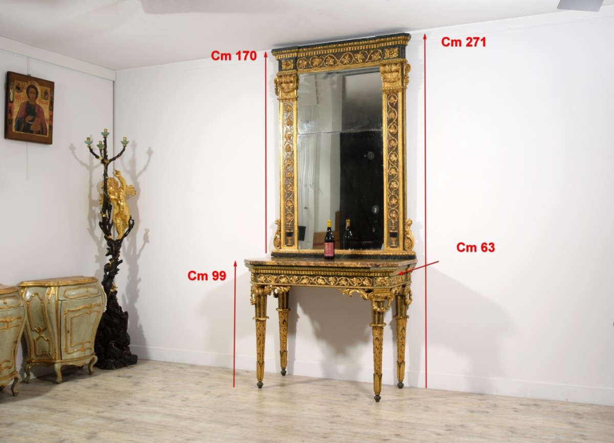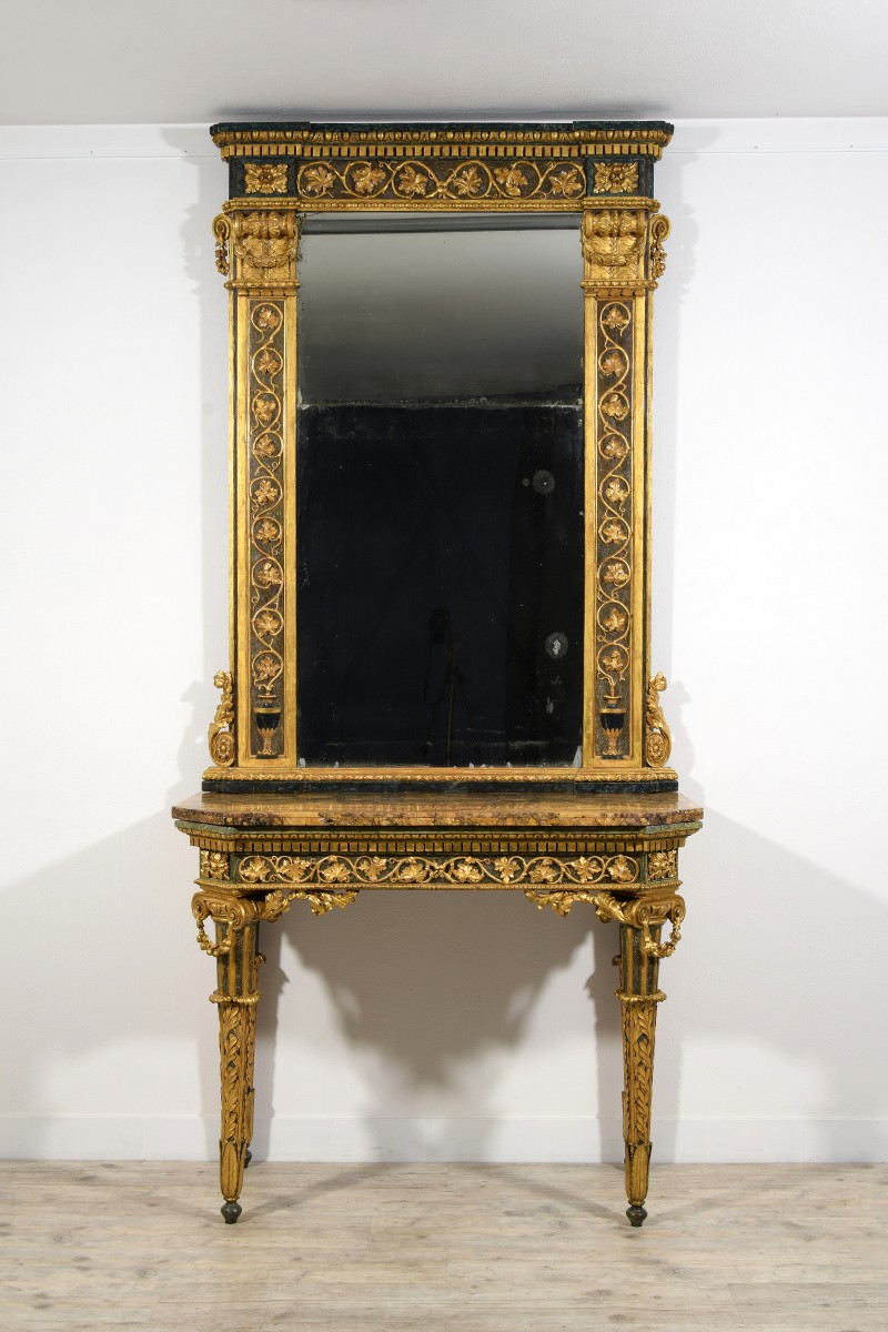 Retrouver le mobilier ou les objets d''art similaires à « Console et miroir néoclassiques en bois sculpté, laqué et doré, Italie fin du XVIIIe » présenté par Brozzetti Antichità, antiquaire à Cherasco dans la catégorie Console Louis XVI, Mobilier.