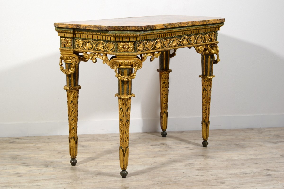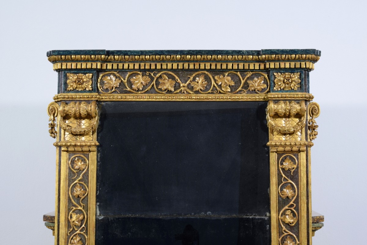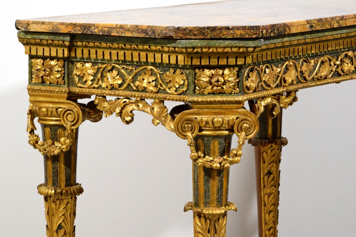 La console présente un plan en marbre pavé en Broccatello d’Espagne qui suit le profil de la structure, avec des angles avant coupés à 45 degrés. La bande sous le plan se compose d’une partie laquée en faux marbre Verde Antico, d’un double cadre sculpté à ovules et de motifs à dents dorées. En dessous, sur une base laquée à faux Porphyre, se détachent des décorations sculptées en relief et dorées avec des motifs de ramage et de feuilles. Sur les coins, les sculptures présentent des éléments phytomorphes insérés dans des cadres.