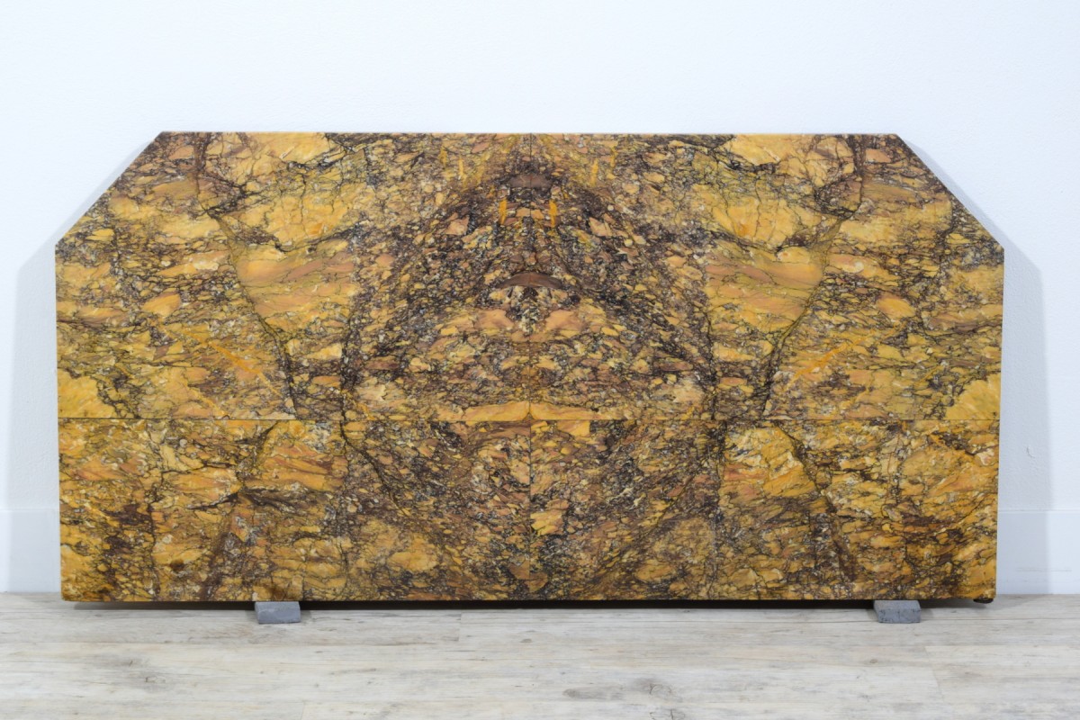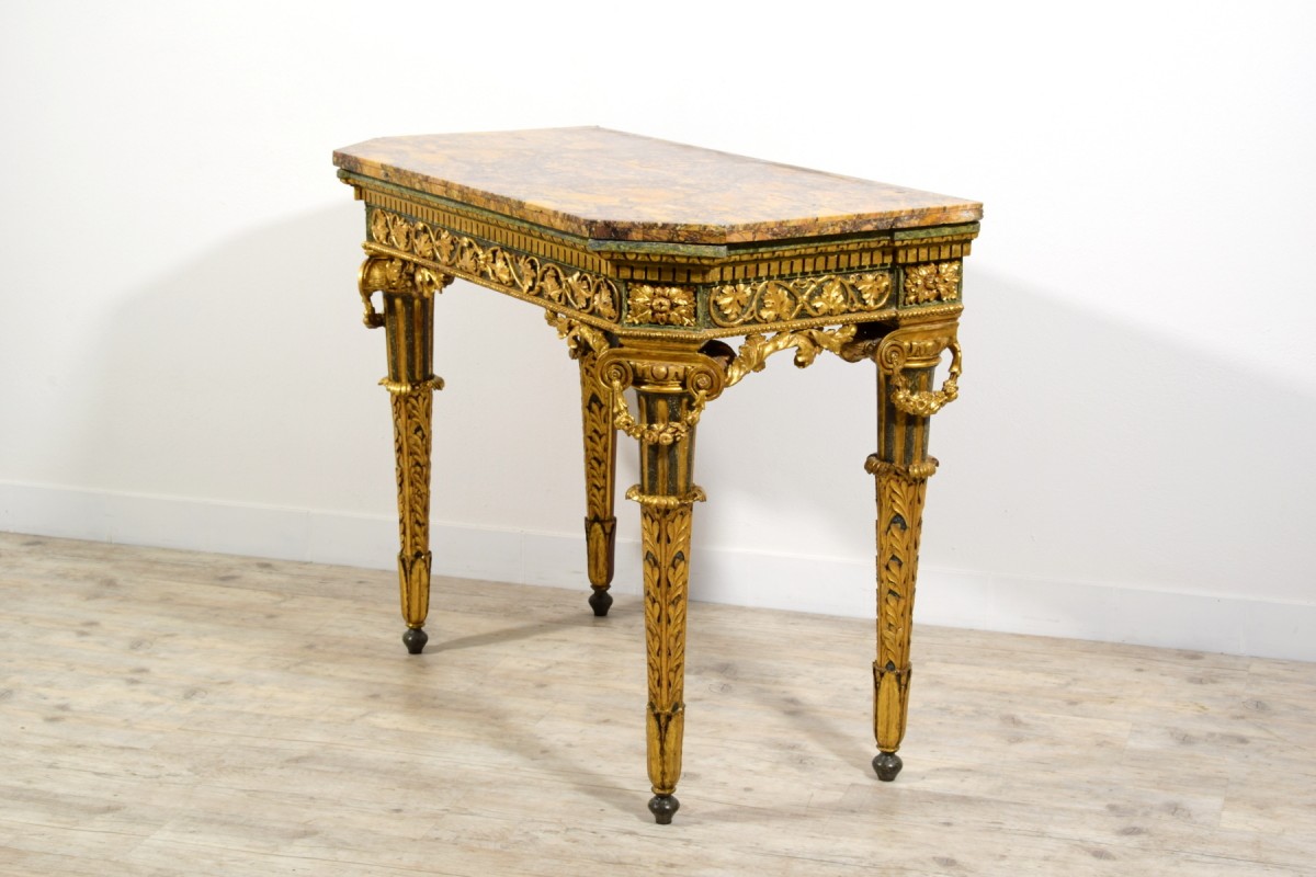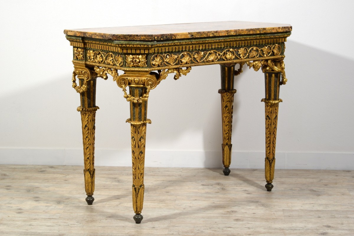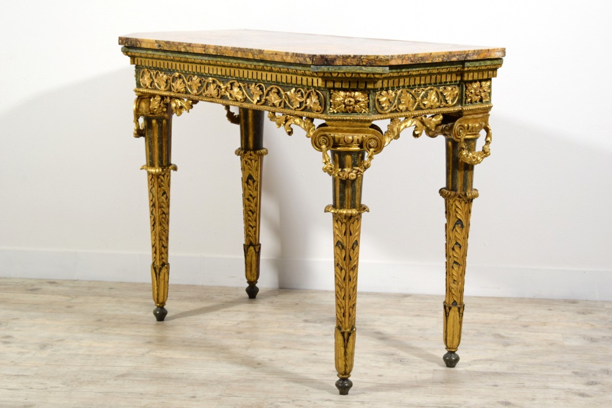 La console présente un plan en marbre pavé en Broccatello d’Espagne qui suit le profil de la structure, avec des angles avant coupés à 45 degrés. La bande sous le plan se compose d’une partie laquée en faux marbre Verde Antico, d’un double cadre sculpté à ovules et de motifs à dents dorées. En dessous, sur une base laquée à faux Porphyre, se détachent des décorations sculptées en relief et dorées avec des motifs de ramage et de feuilles. Sur les coins, les sculptures présentent des éléments phytomorphes insérés dans des cadres.