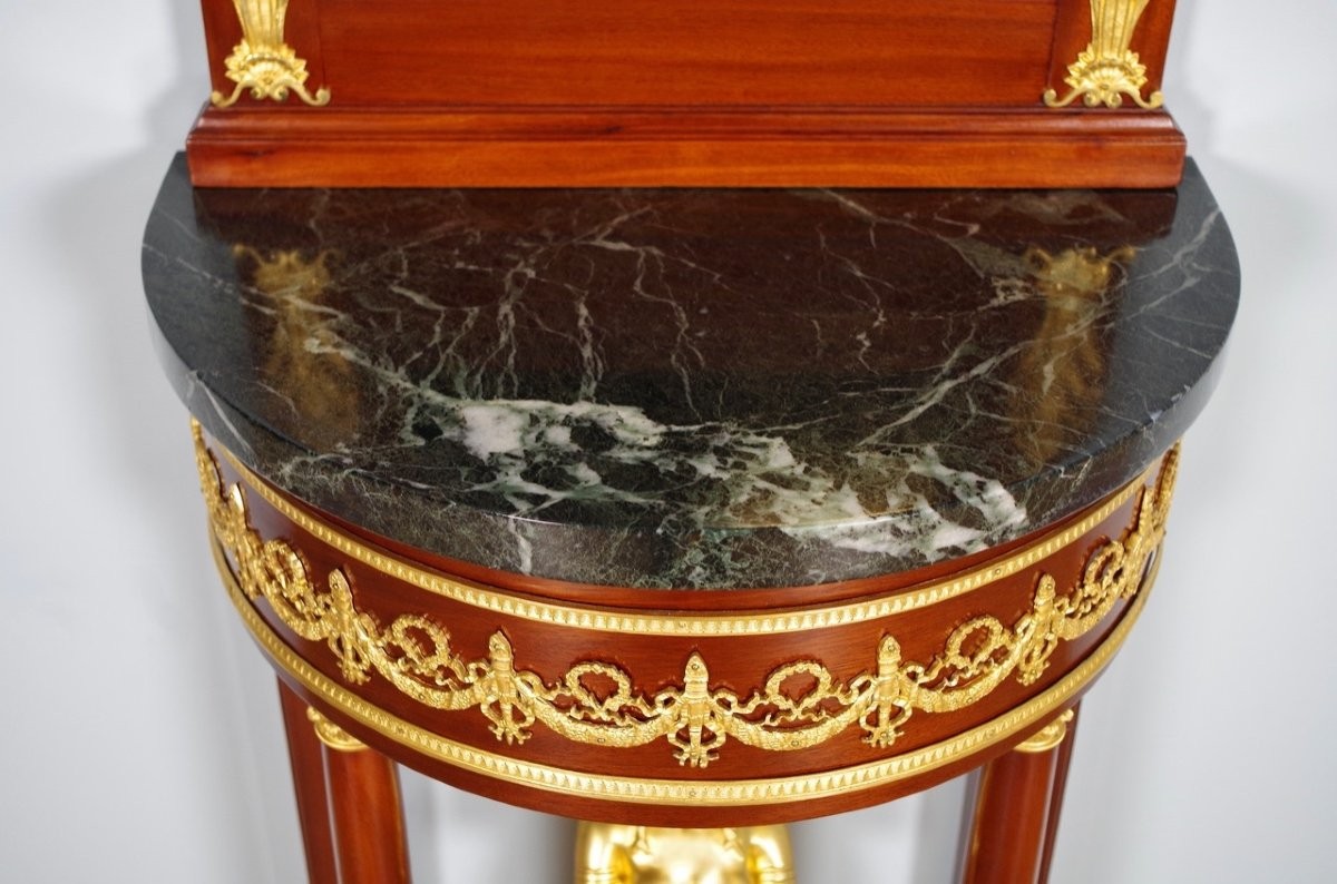 Bel ensemble console demi-lune et miroir en acajou et bronze doré.