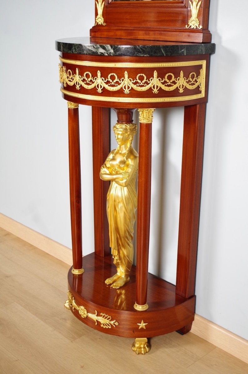 Hauteur totale 247 cm (miroir 142,5 cm, console 104,5 cm), largeur 55 cm, profondeur 33 cm.