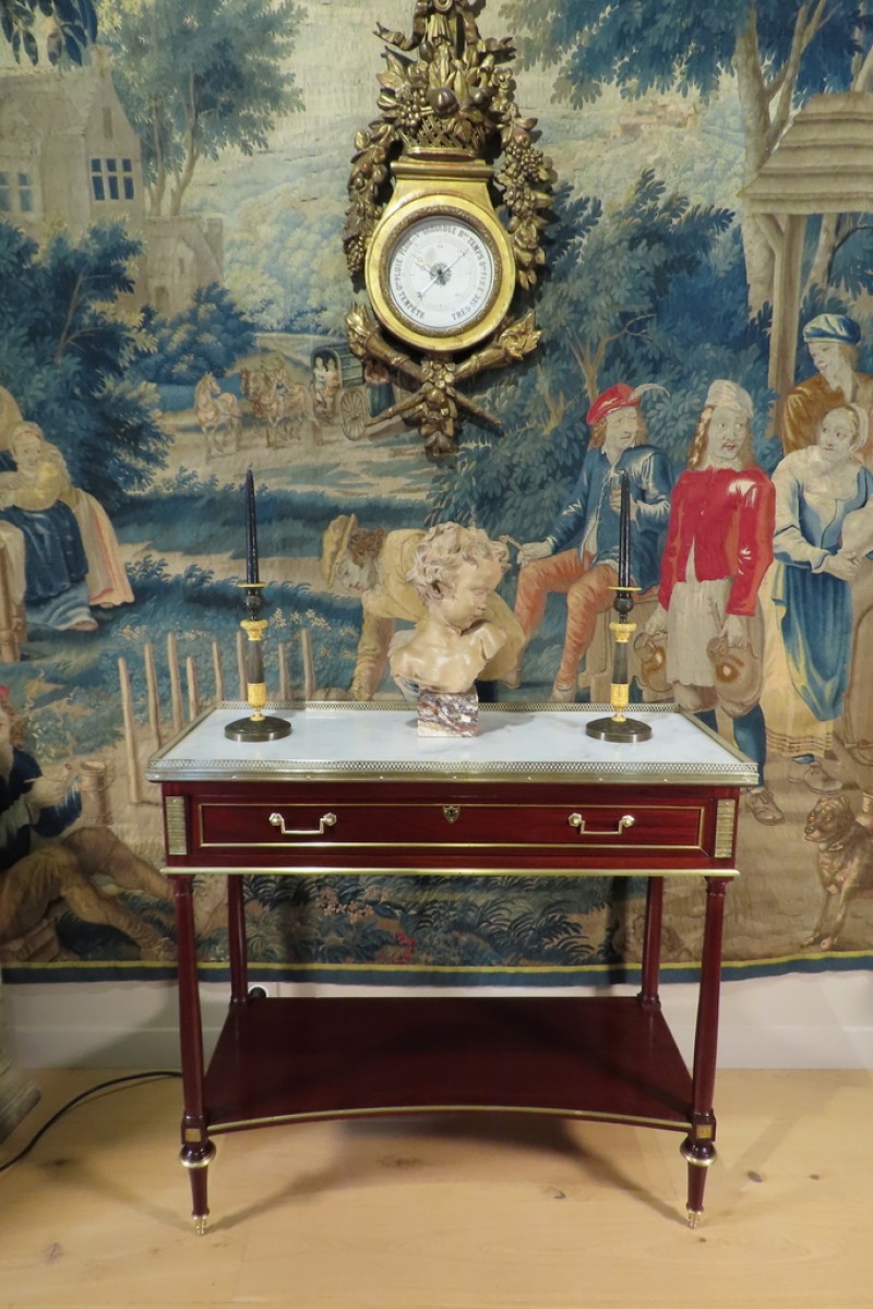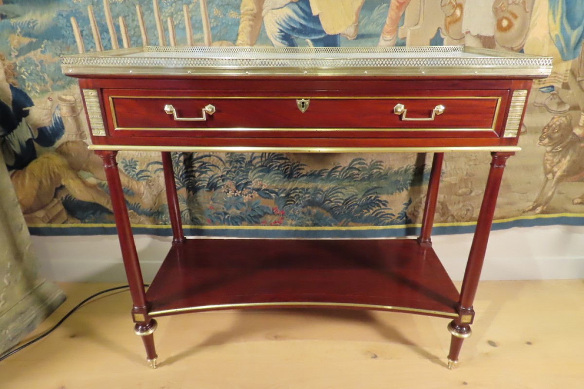Console en acajou et placage d’acajou agrémentée de filets et grattoirs de laiton, ouvrant par un tiroir. Elle est supportée par quatre pieds fuseaux, terminés par une toupie stylisée et son plateau d’entre jambes à léger filet de marqueterie. Cette console est agrémentée d’un marbre blanc veiné gris ceinturé d’une galerie. Console en bel état avec une finition rempli ciré. Epoque Directoire.