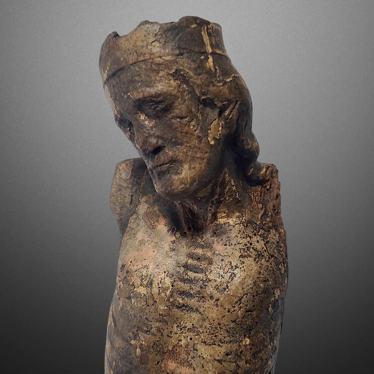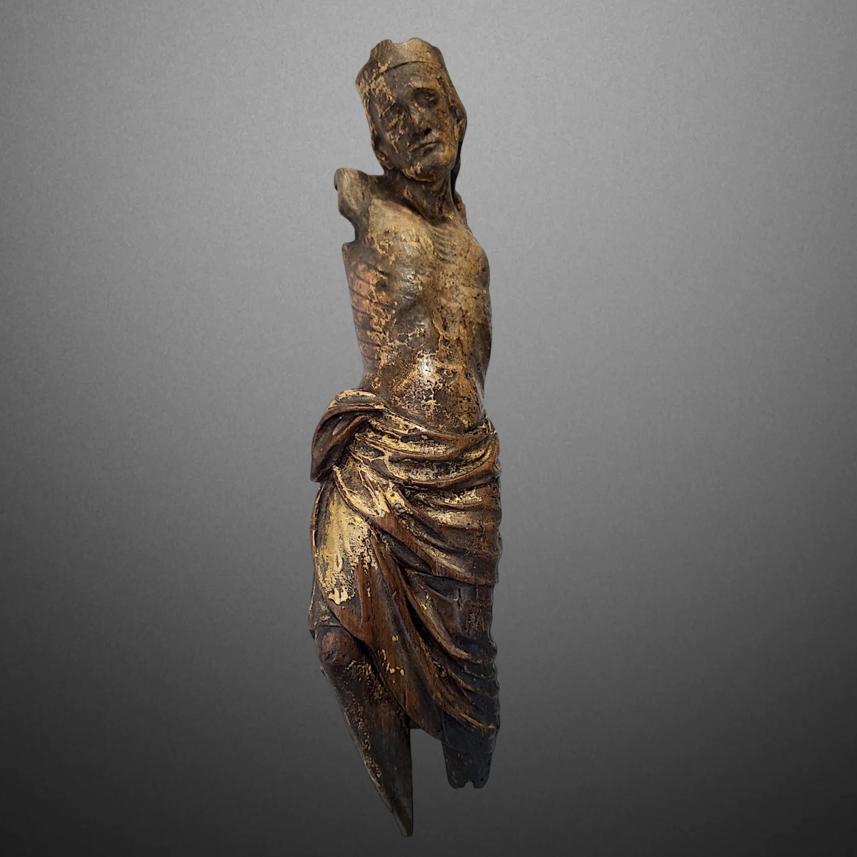 Christ couronné, des confins de la Bourgogne septentrionale et de la Champagne méridionale et datant du dernier tiers du XIIIe siècle. Sculpté en bois de noyer polychromé et doré, ce Christ conserve des traces significatives de sa polychromie et de sa dorure d'origine. Sur le torse et notamment sur les côtes, la carnation est encore bien visible, comme les dorures au périzonium et à la couronne. Ce Corpus Christi, saisissant de présence, illustre parfaitement le gothique rayonnant avec des rémanences du gothique classique, en représentant notamment le Christ Roi.