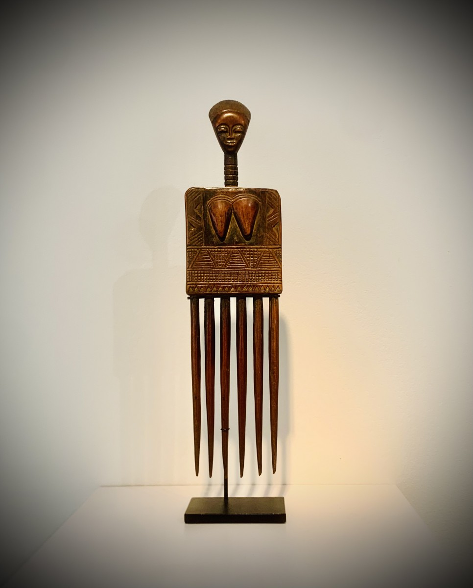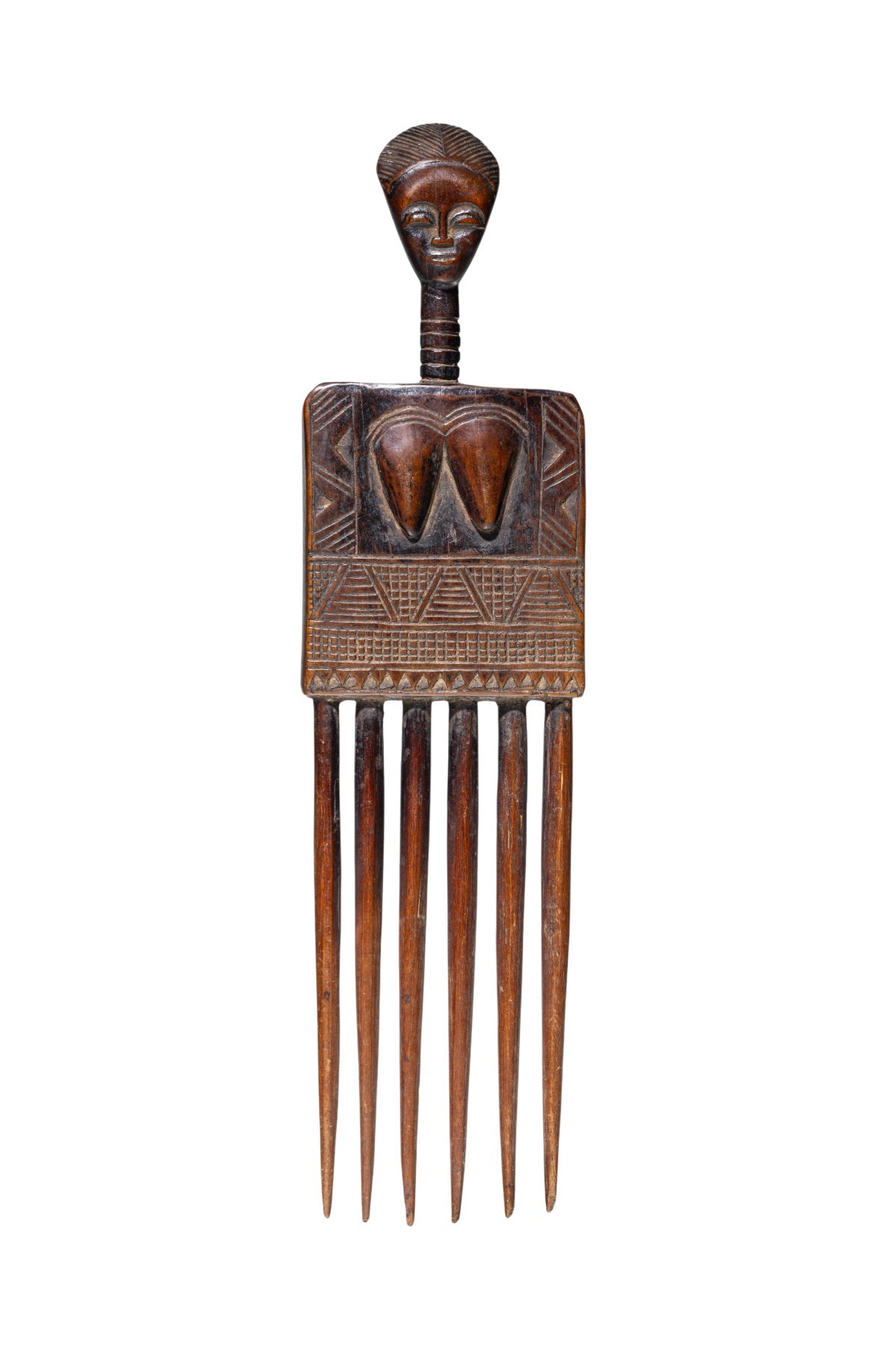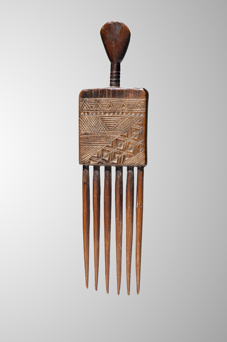 Le peigne est composé de six longues dents effilées prolongées d’un corps rectangulaire orné de motifs géométriques. Sur cet espace deux formes en relief évoquent une poitrine féminine, symbole fécondité. Les décors incisés — triangles, lignes croisées, motifs en chevrons — renforcent l’esthétique graphique de l’objet. La partie supérieure de l’objet présente quant à elle un visage féminin stylisé au cou annelé. La patine sombre et lustrée indique une longue manipulation.