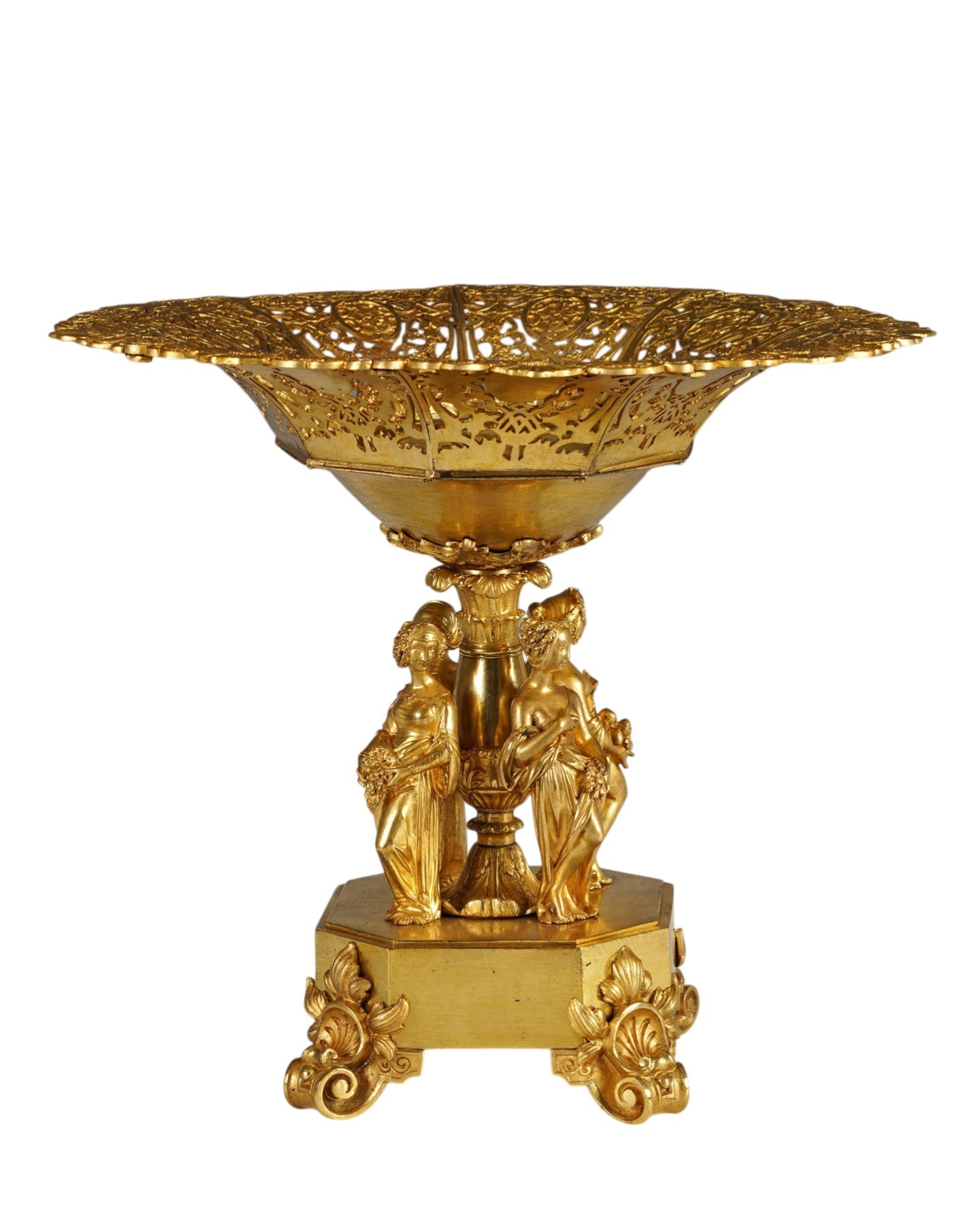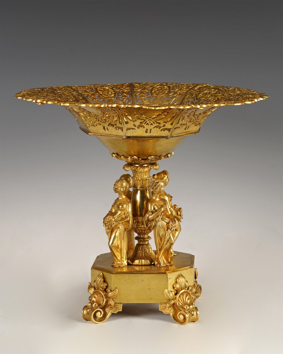 Belle coupe en bronze ciselé et doré composée d’un bassin à bordure ajourée d’une grande finesse à décor de rinceaux, arabesques et motifs végétaux entrelacés. Le contraste entre les pleins et les vides accentue le jeu de la lumière sur la dorure, animant la surface d’un miroitement subtil.