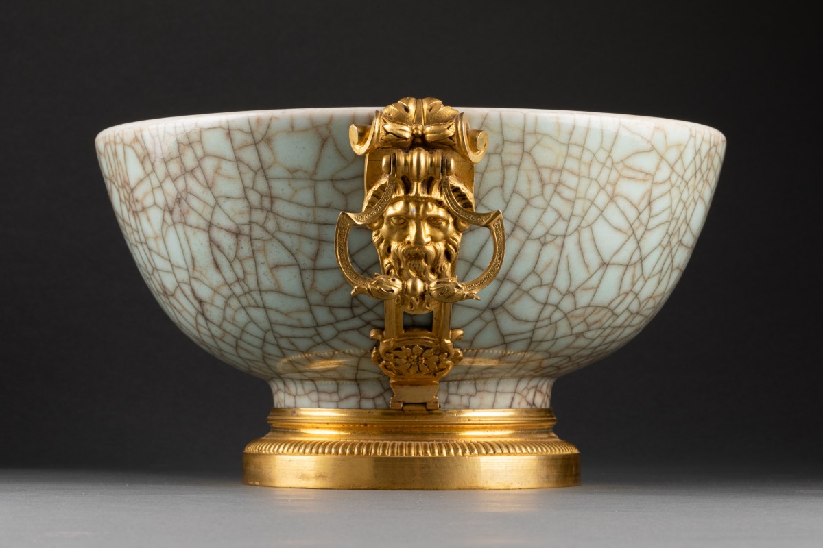 Coupe en porcelaine Céladon Chine XVIIIe ceint d'une monture européenne époque Régence en bronze ciselé et doré à décor de divinités anciennes dotées de poignées.