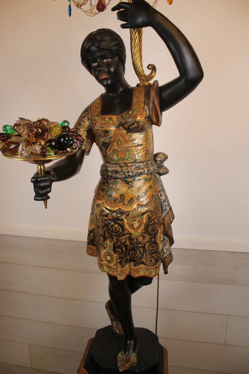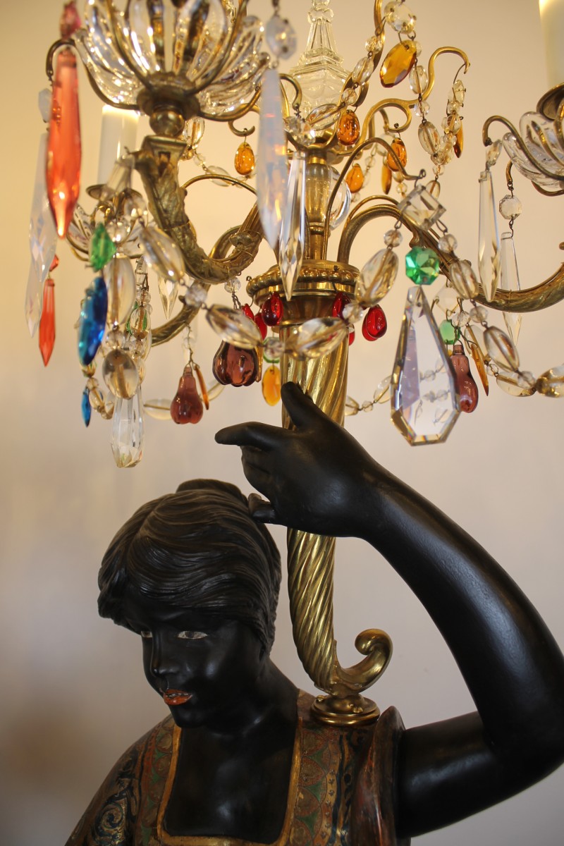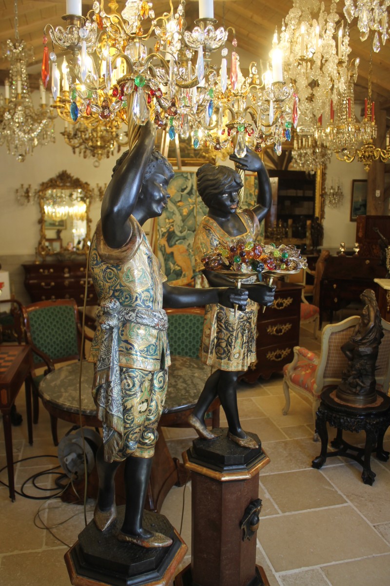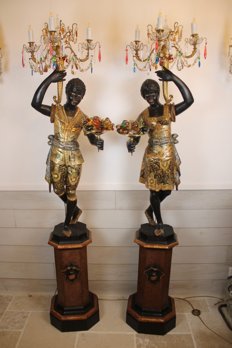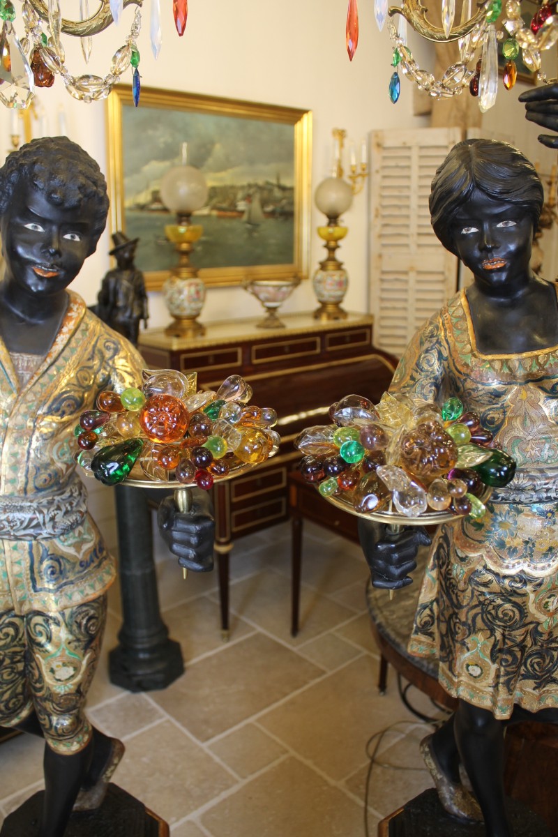 Ils portent sur l'épaule une torchère en bronze simulant une corne d'abondance surmontée de trois bras de lumières, et une coupe remplie de fruits en verre de Murano dans la main opposée.