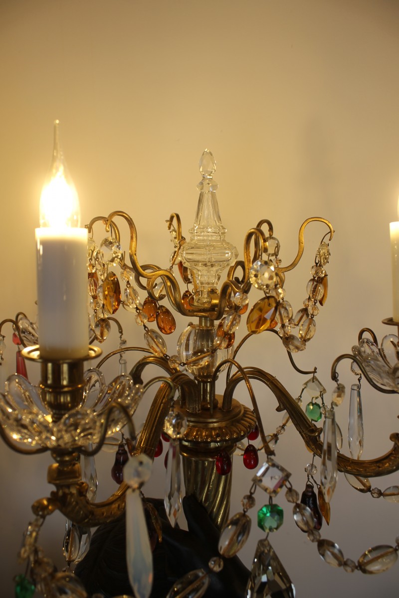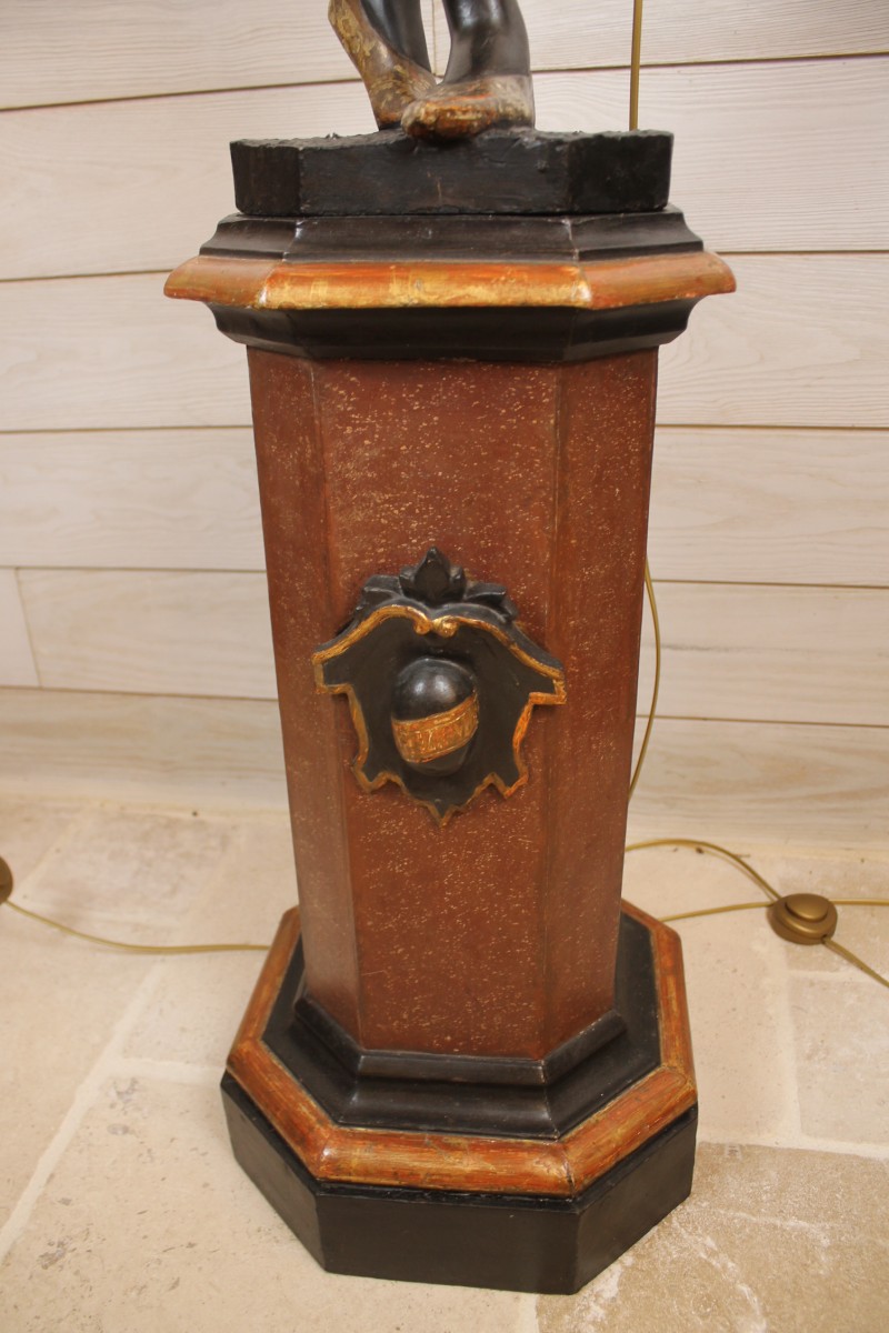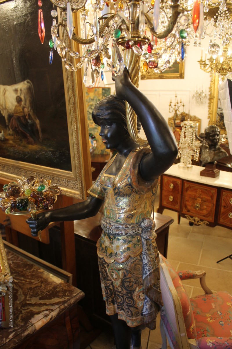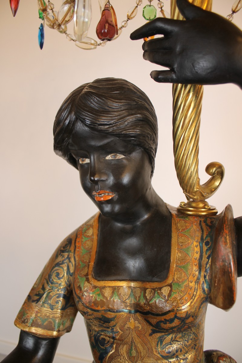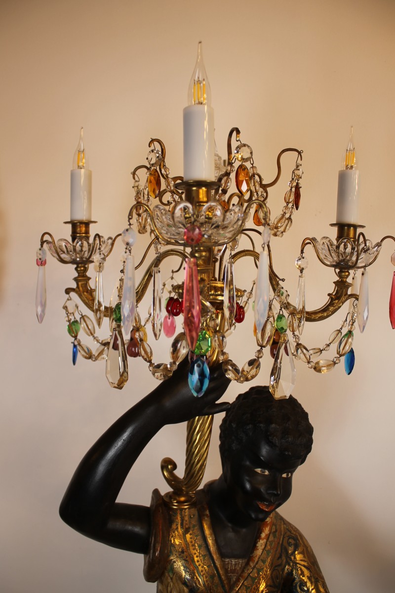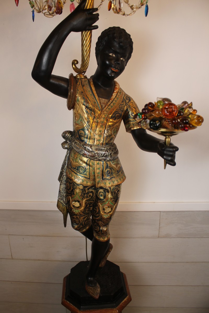 Ils portent sur l'épaule une torchère en bronze simulant une corne d'abondance surmontée de trois bras de lumières, et une coupe remplie de fruits en verre de Murano dans la main opposée.