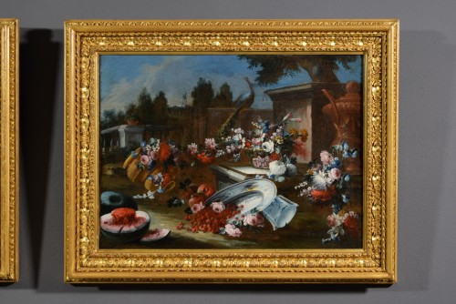 Les peintures, de belle facture et en bon état de conservation, représentent des compositions fastueuses de fleurs et de fruits insérés dans d’élégants jardins. Attribuables au peintre napolitain Francesco Lavagna, ils présentent des analogies de composition et de style avec des œuvres certaines et signées du peintre.