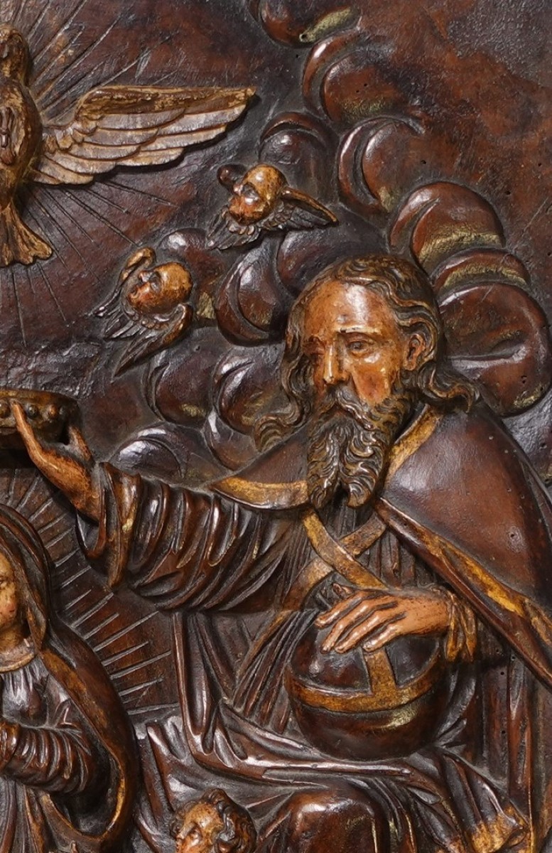 Charmant bas-relief en noyer sculpté dont l'iconographie est la glorification de Marie grâce à son couronnement par la Trinité.