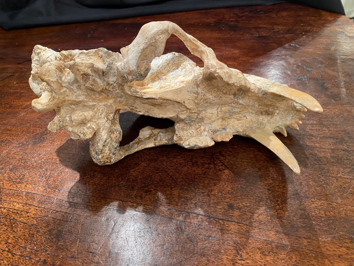 Homotherium crenatidens Eurasie, Pleistocène espèce disparue il y a 30 000 ans en Eurasie et 10 000 ans sur le continent américain. Minéralisation grsée Légère déformation latérale
