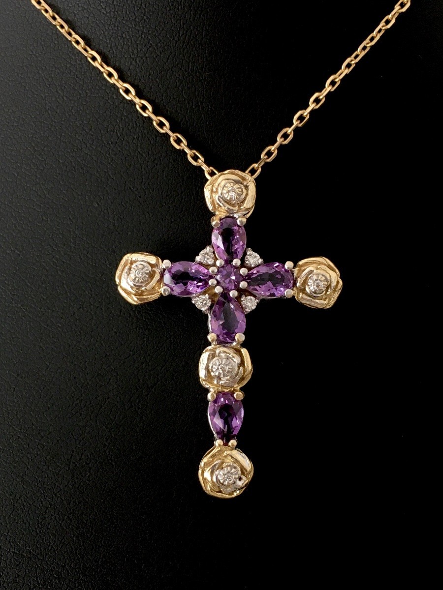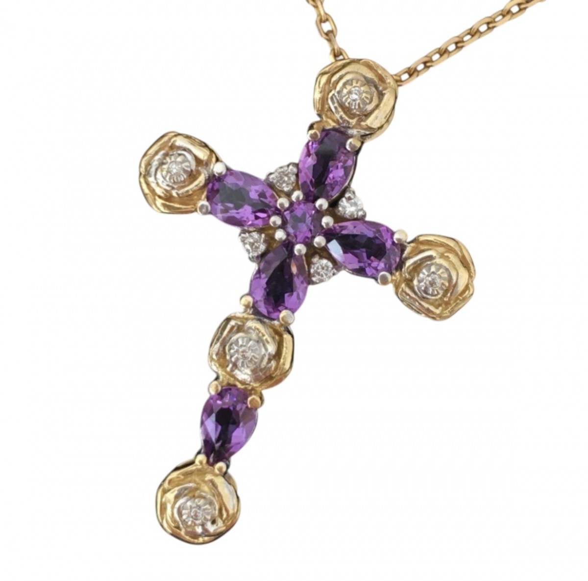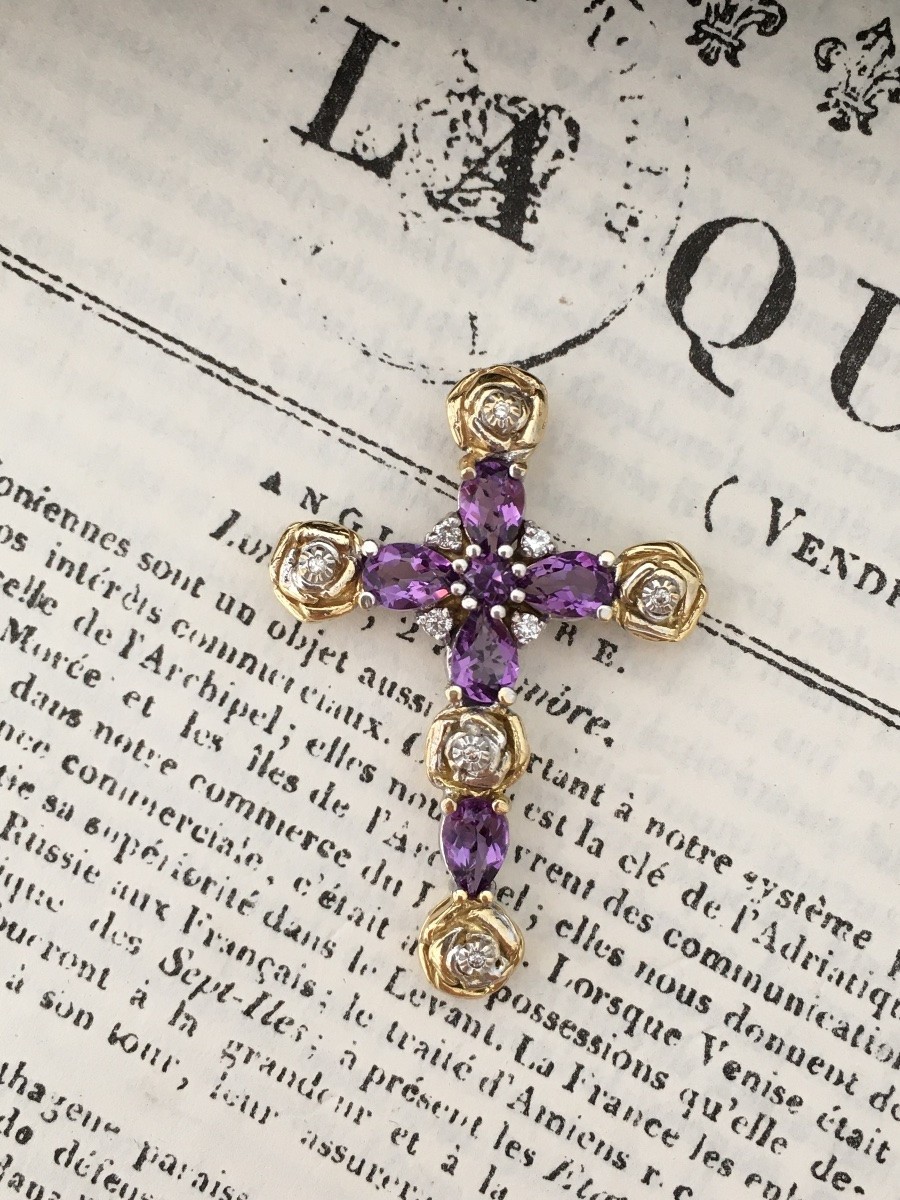 Croix en or blanc et jaune 18K composée de 5 améthystes taille poire et une améthyste taille rond.