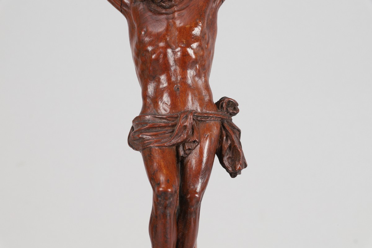 Un crucifix sculpté en ronde-bosse en bois de Sainte-Lucie, réalisé en Lorraine (Nancy ?) vers le milieu du XVIIIème siècle. Le christ, dont la tête est inclinée vers l’avant, présente un corps musclé et dénudé, à l’exception du périzonium qui ceint ses reins. Au sommet de la croix, se trouve l’inscription « I.N.R.I » : il s’agit du titulus qu’a fait mettre Ponce Pilate sur la Croix et qui signifie « Iesus Nazarenus Rex Iudaeorum » (« Jésus de Nazareth, Roi des Juifs »). La Croix repose sur un socle à trois niveaux. À l’arrière de la Croix, se trouve une mention manuscrite à l’encre : « Le crucifix a été bénit à la mission Royale à […] ». L’hôtel de la Mission Royale est très certainement celui de Nancy, où Stanislas Leszczynski a fait construire un bâtiment dédié aux Jésuites entre 1741 et 1743. Le roi s’y était fait réserver un appartement au rez-de-chaussée pour ses rares séjours dans la capitale de l’ancien duché. ...
