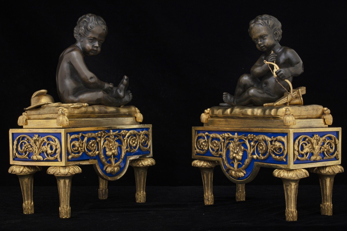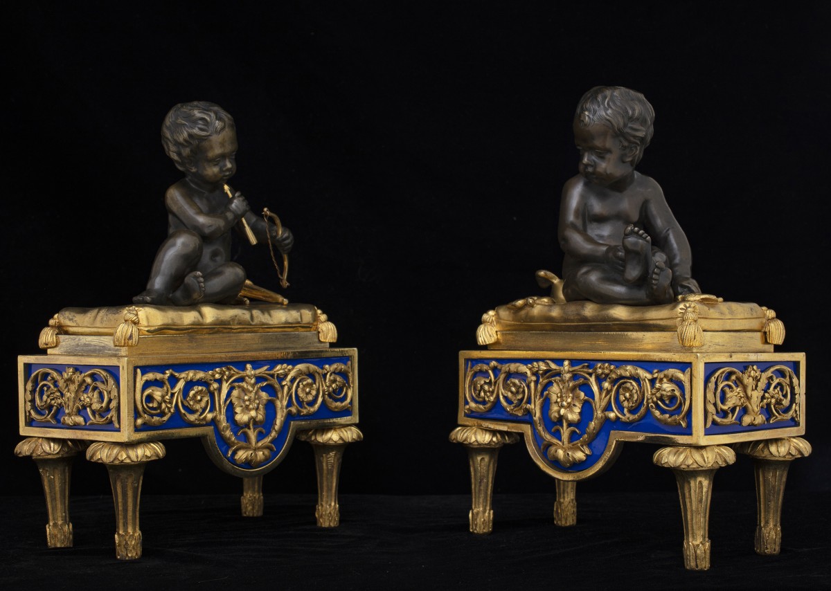 Cupidon et Mercure, paire d'objets latéraux en bronze bruni et en bronze finement ciselé et doré, sur fond laqué bleu cobalt. Cupidon est assis sur un coussin, tenant un arc, un carquois et des flèches ; Mercure est assis sur un coussin, coiffé d'un casque ailé.