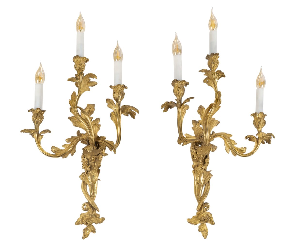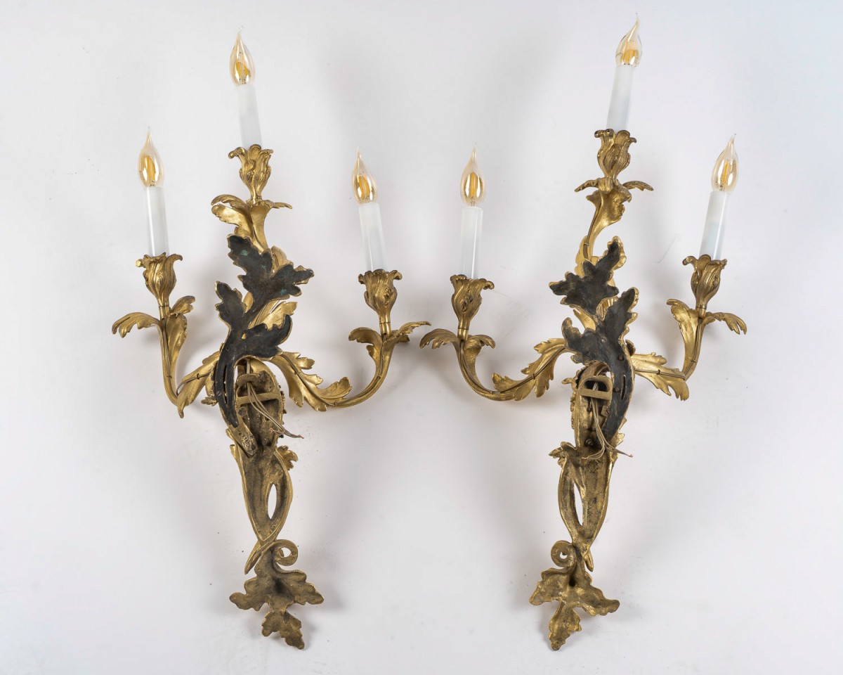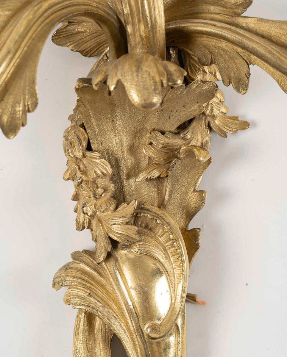 Réalisation française d’exception, ces appliques s’inscrivent dans la tradition ornementale du style Louis XV. Elles portent au dos la marque du bronzier B B ainsi que le numéro 12504, et datent des environs de 1850.
