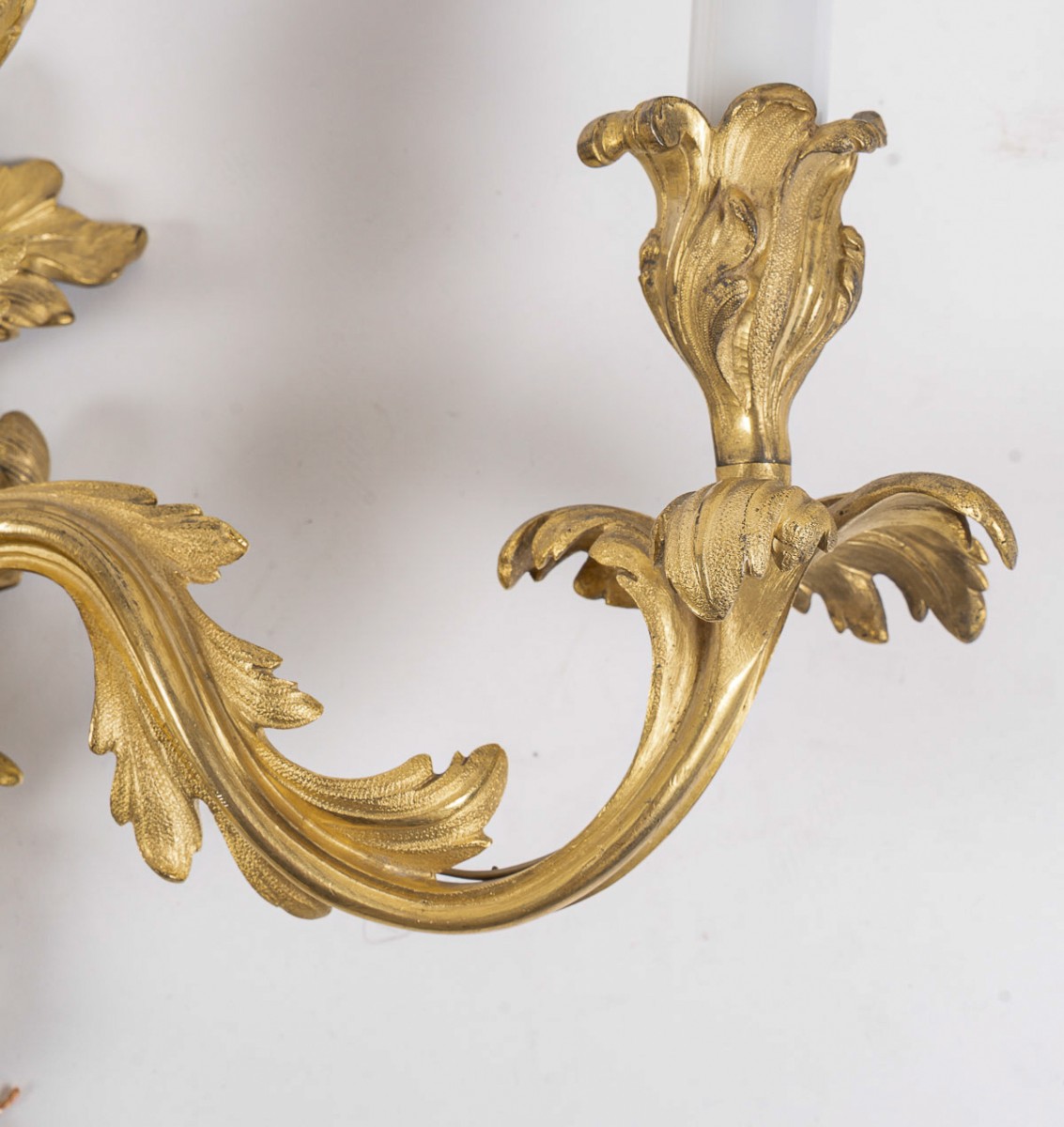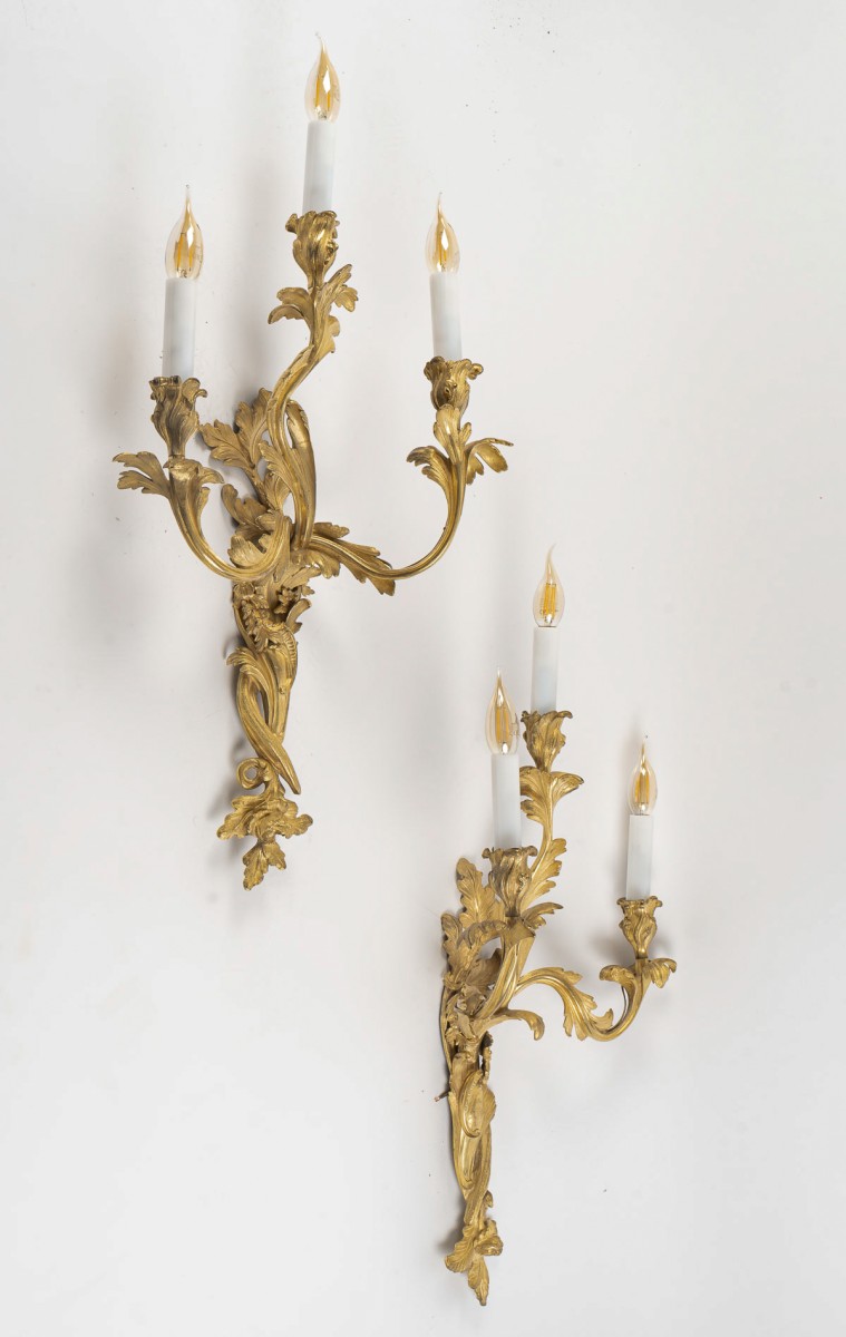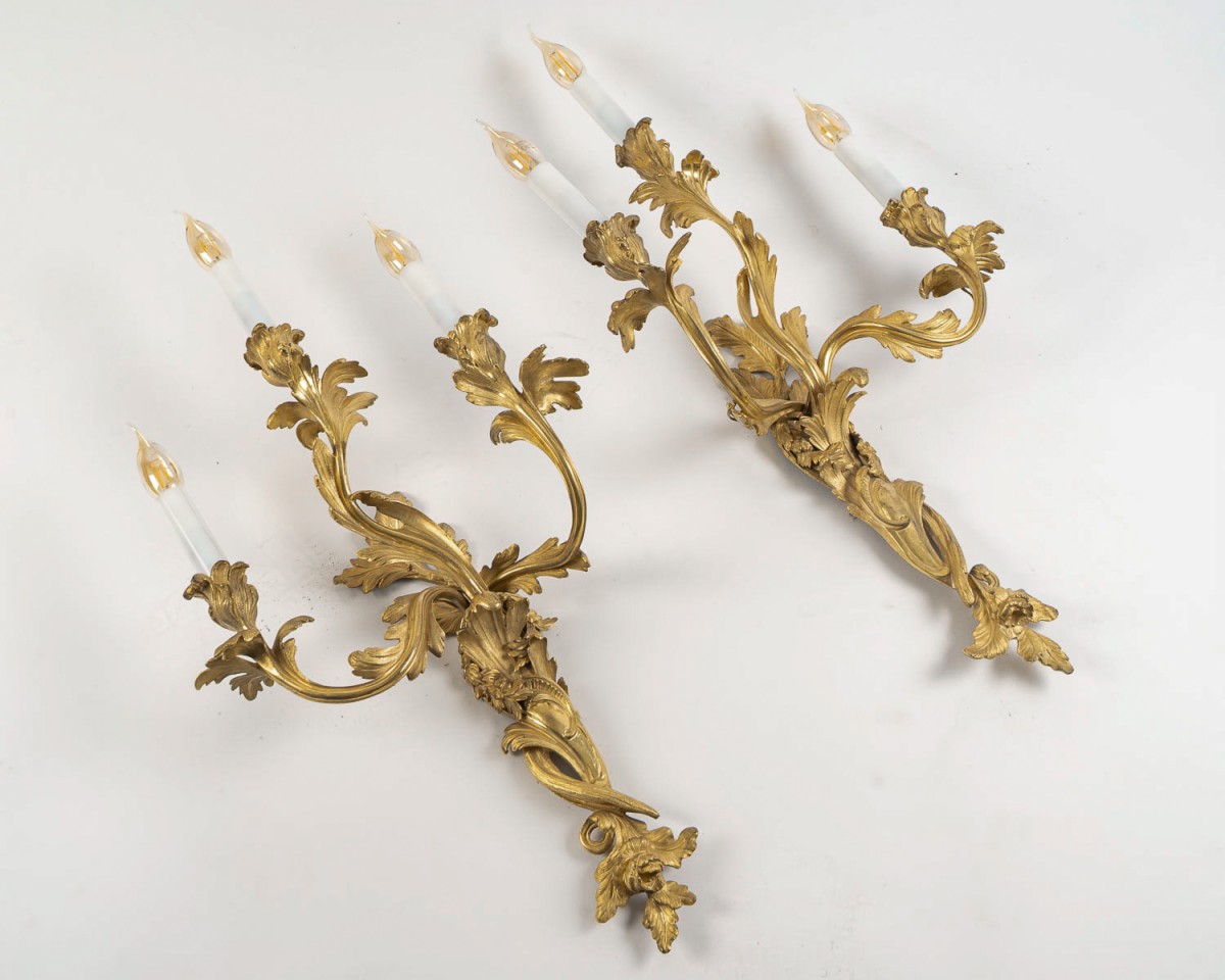 Une élégante et décorative grande paire d’appliques, finement ciselée et richement dorée, se distingue par ses trois bras de lumière aux motifs de fleurs et de feuillages. Leur style mouvementé s’inspire des modèles dessinés et créés par Juste-Aurèle Meissonnier au milieu du XVIIIe siècle.