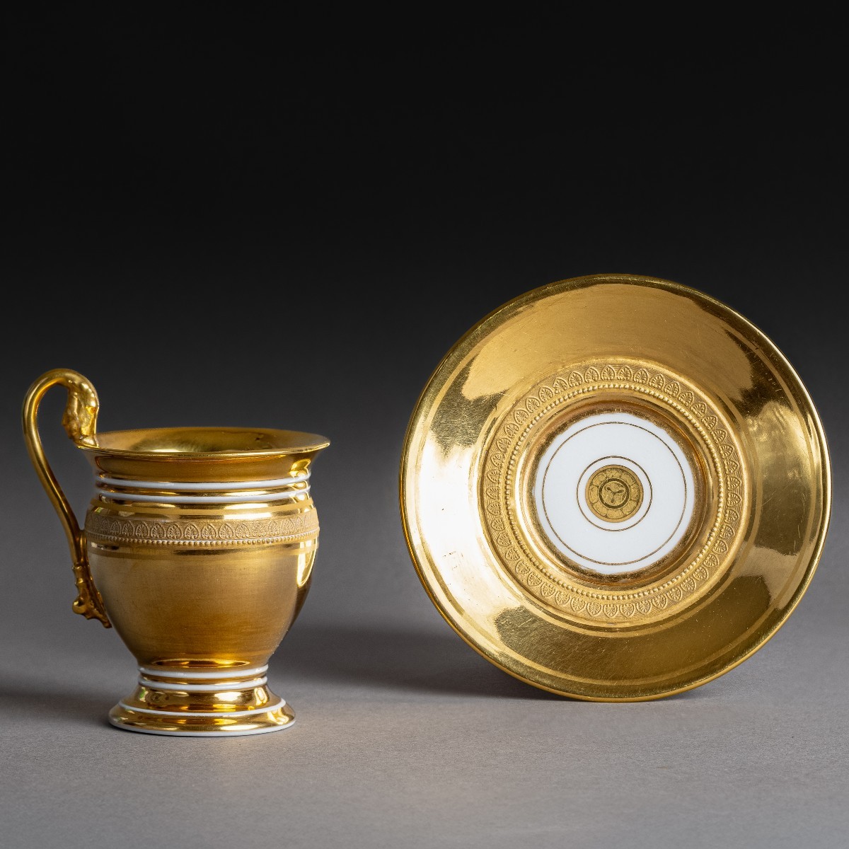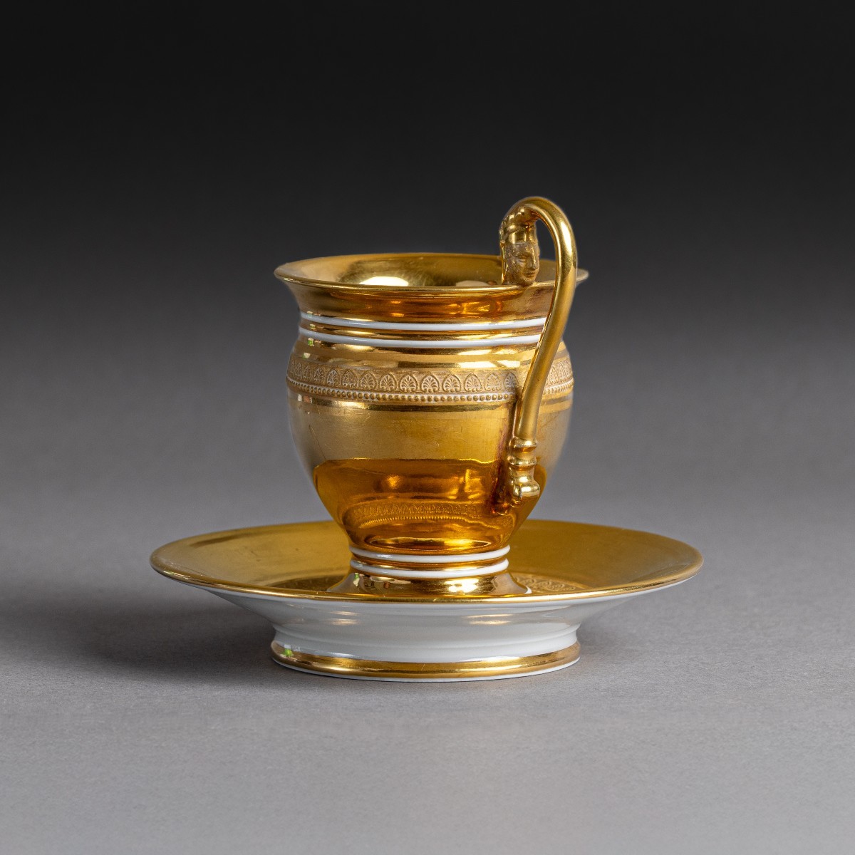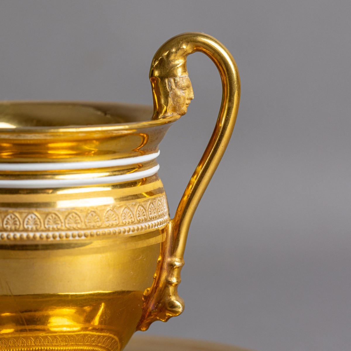 Inusuelle tasse ovoïde et sa soucoupe à décor intégralement "à l'or épais". Délicats contrastes entre les mats et les brunis. L'on note l'anse à figure féminine. Application d'un décor en relief de frises de perles, d'oves et de palmettes d'après le procédé "à la molette" développé et breveté par la Manufacture de Nast.