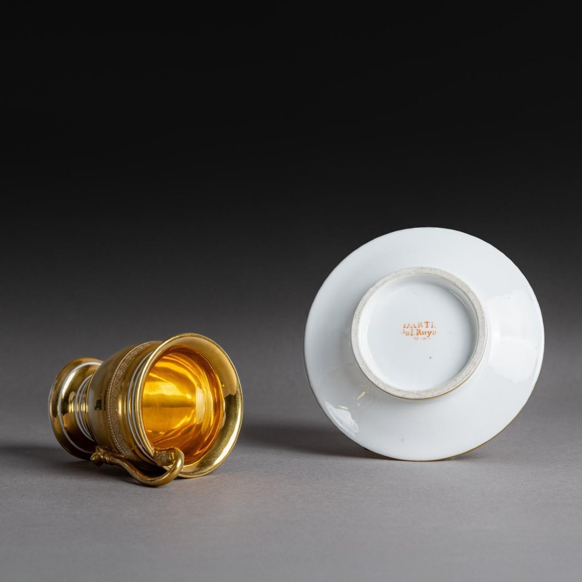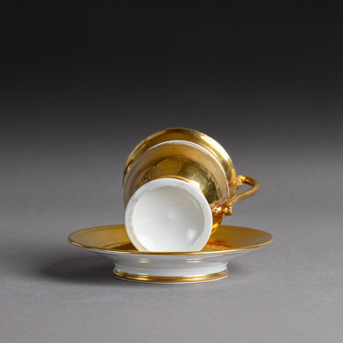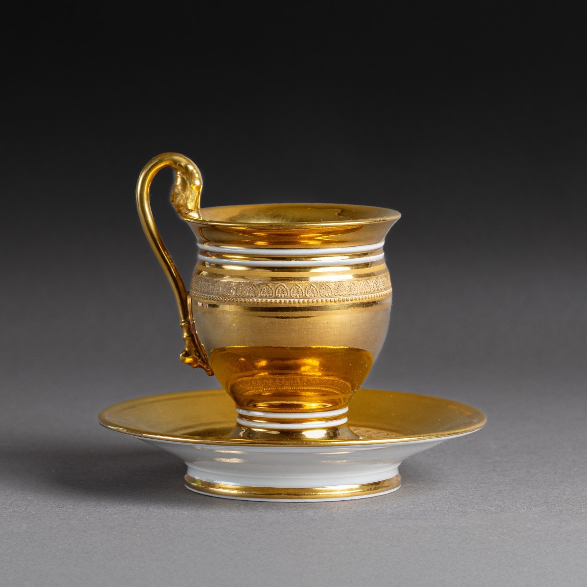 Inusuelle tasse ovoïde et sa soucoupe à décor intégralement "à l'or épais". Délicats contrastes entre les mats et les brunis. L'on note l'anse à figure féminine. Application d'un décor en relief de frises de perles, d'oves et de palmettes d'après le procédé "à la molette" développé et breveté par la Manufacture de Nast.