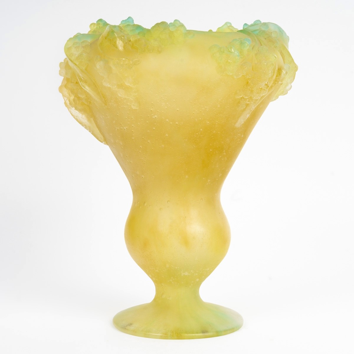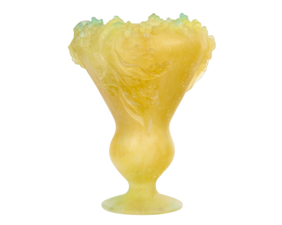 Vase "Mimosa" en pâte de verre jaune et verte de Daum France. Signature gravée. Parfait état. Imposant par sa taille et sa qualité ! Hauteur : 30 cm