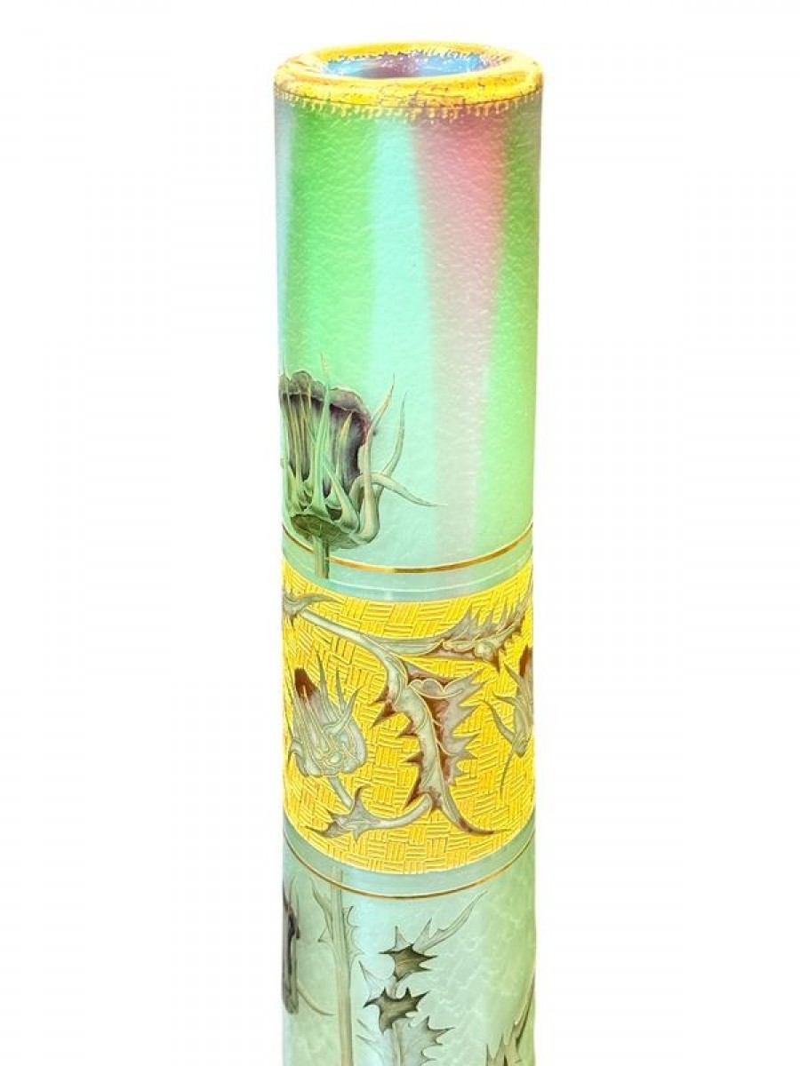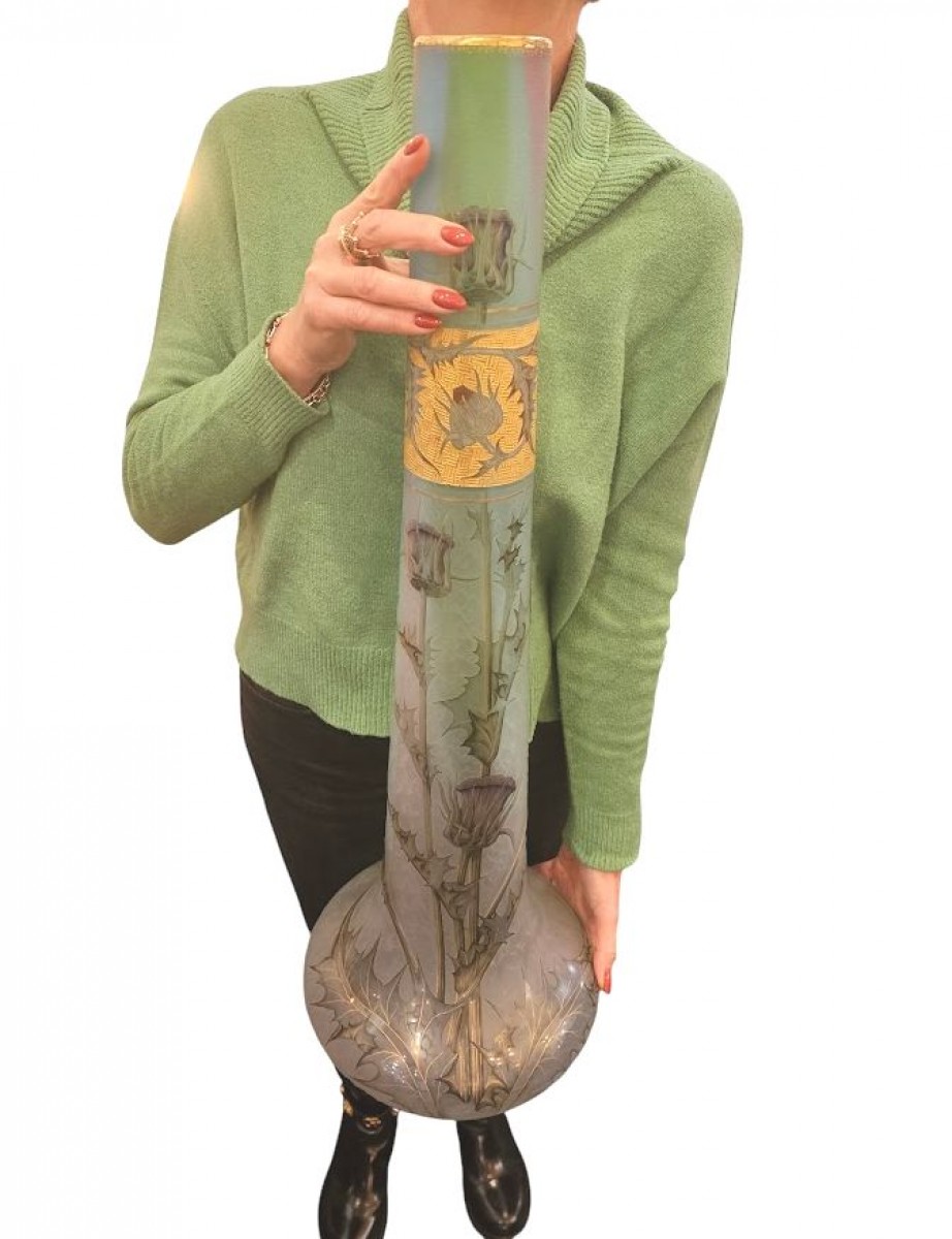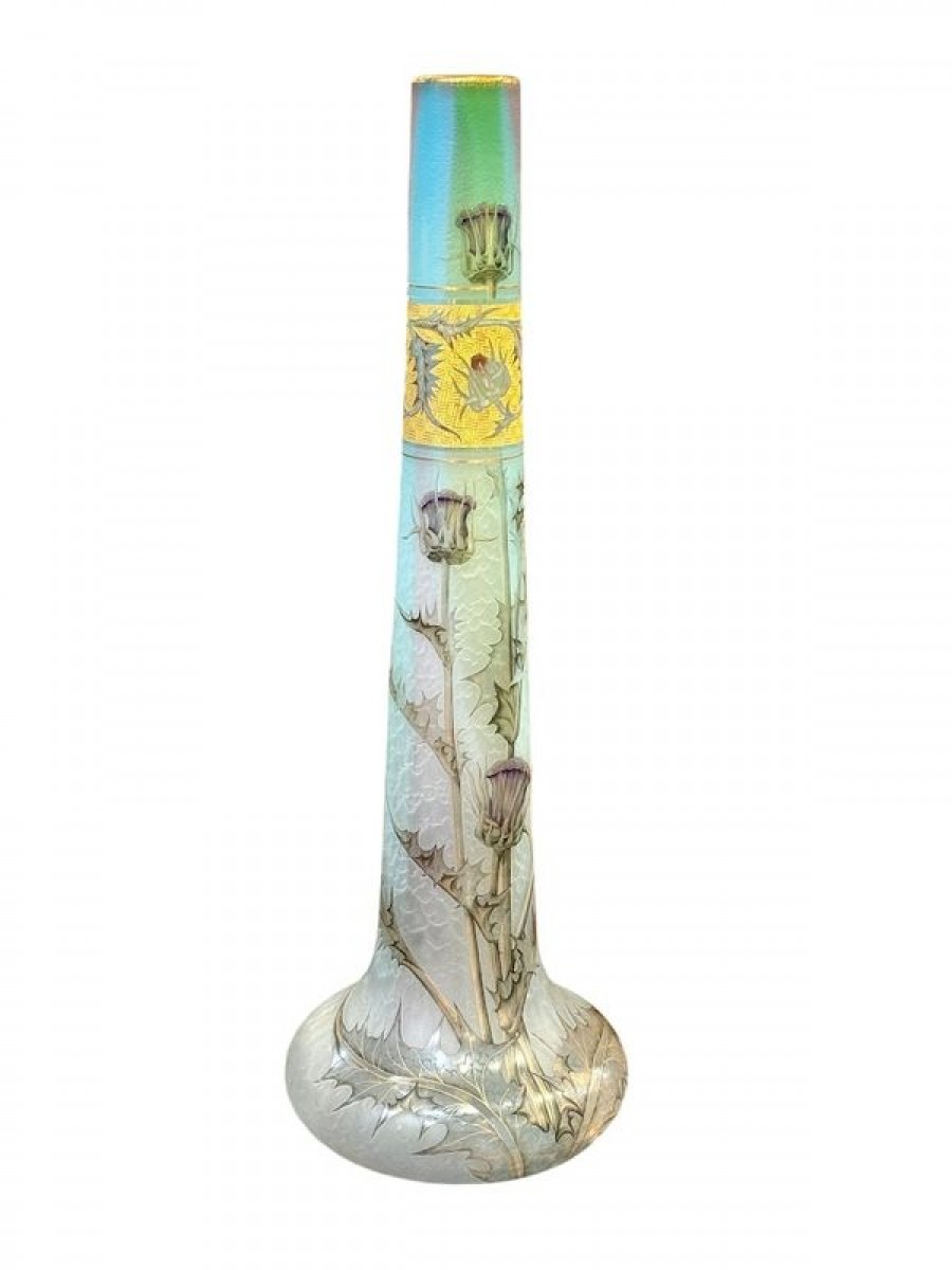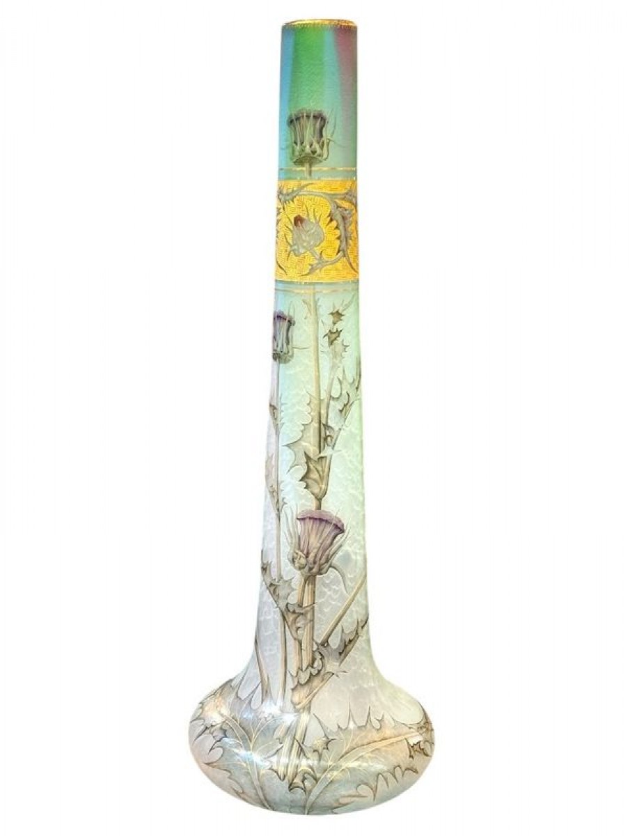 Rare et spectaculaire vase en verre incolore soufflé moulé, doublé opale bleuté, partiellement teinté en intercalaire de poudres roses, vertes et bleues. Superbe décor gravé en fines réserves à l'acide, émaillé polychrome et réhaussé à l'or, de chardons sur un fond granité. Exceptionnel gabarit et remarquable rendu lumineux!