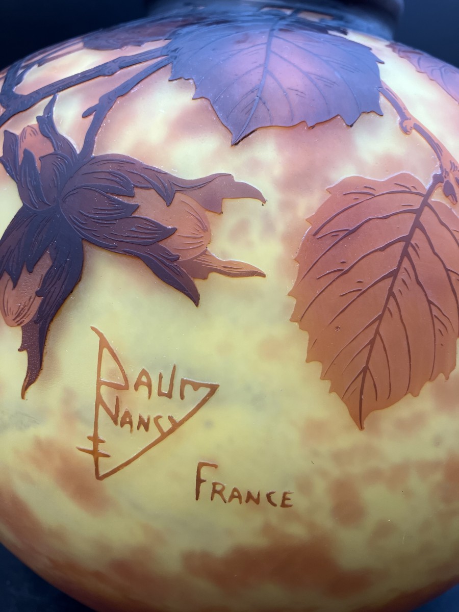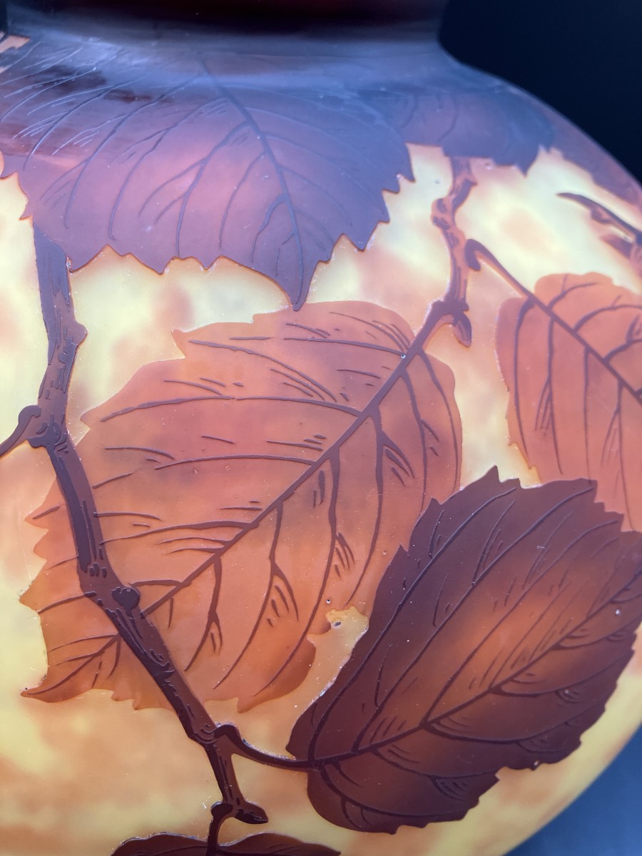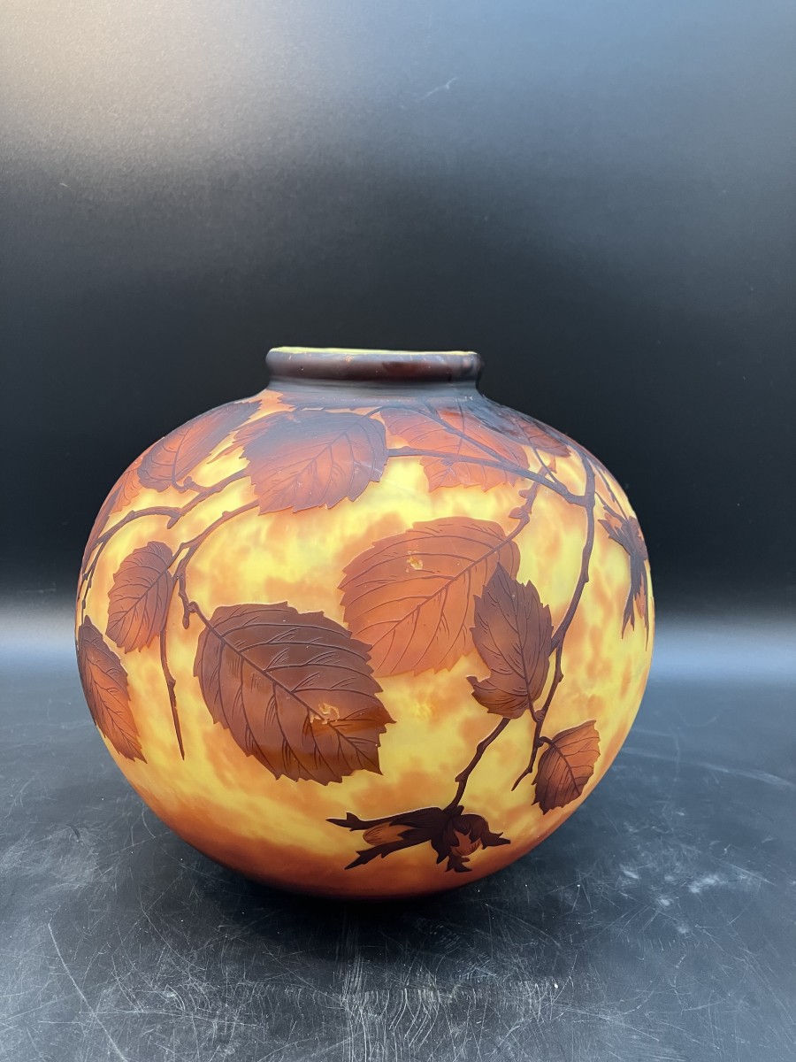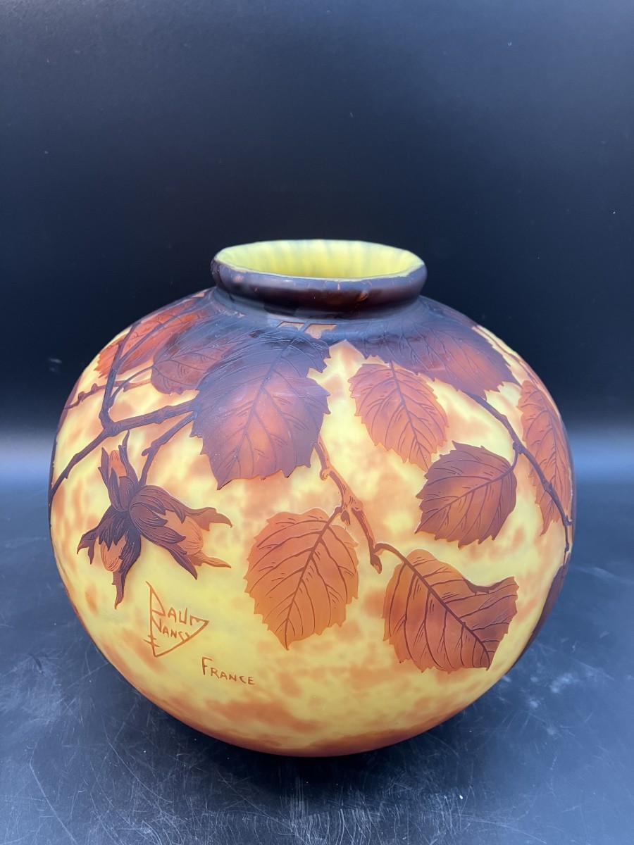 Important vase boule art nouveau par Daum Nancy. En verre multicouches gravé à l'acide d'un décor de noisetier. Epoque début XXème siècle , art nouveau. Très bon état. Diamètre au col 9 cm, à la base 9 cm.